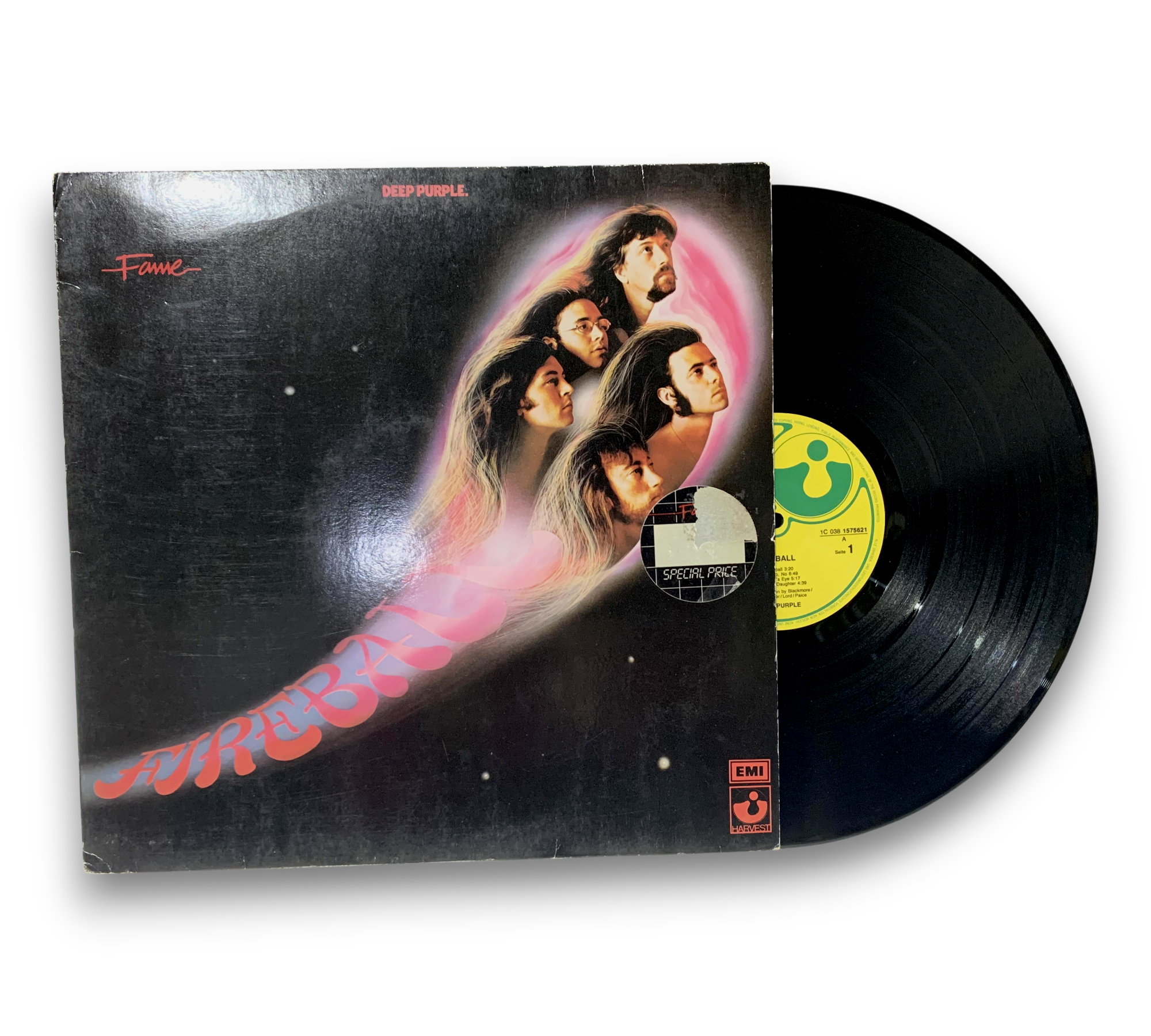 This is a special-price reissue of Deep Purple's album "Fireball," released in the mid-1980s under the Fame label. The record features a simple sleeve design without lyrics or credits, and includes an inner sleeve branded with the Fame logo. The back cover displays the EMI logo and indicates that it was made in the EEC. The matrix runout numbers "92726-A3" and "92726-B3" are stamped, while the others are etched. For further details regarding the packaging and inserts, please refer to the accompanying photos.