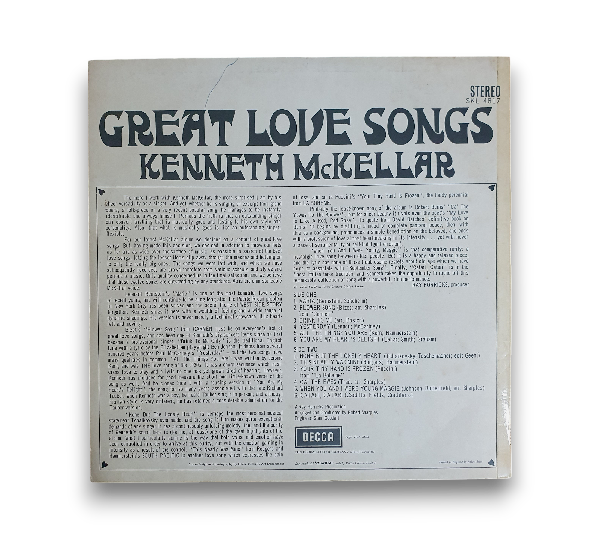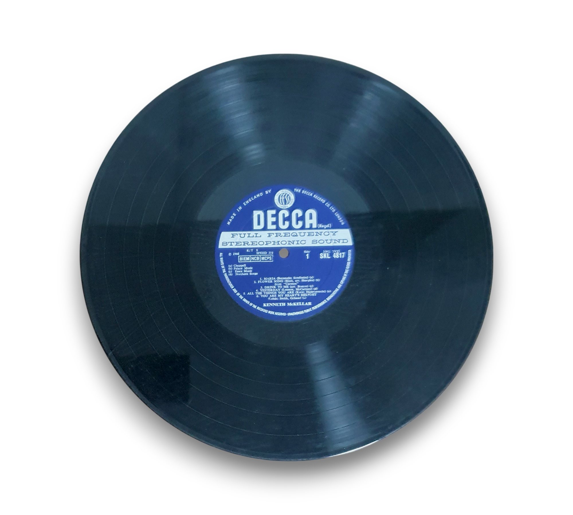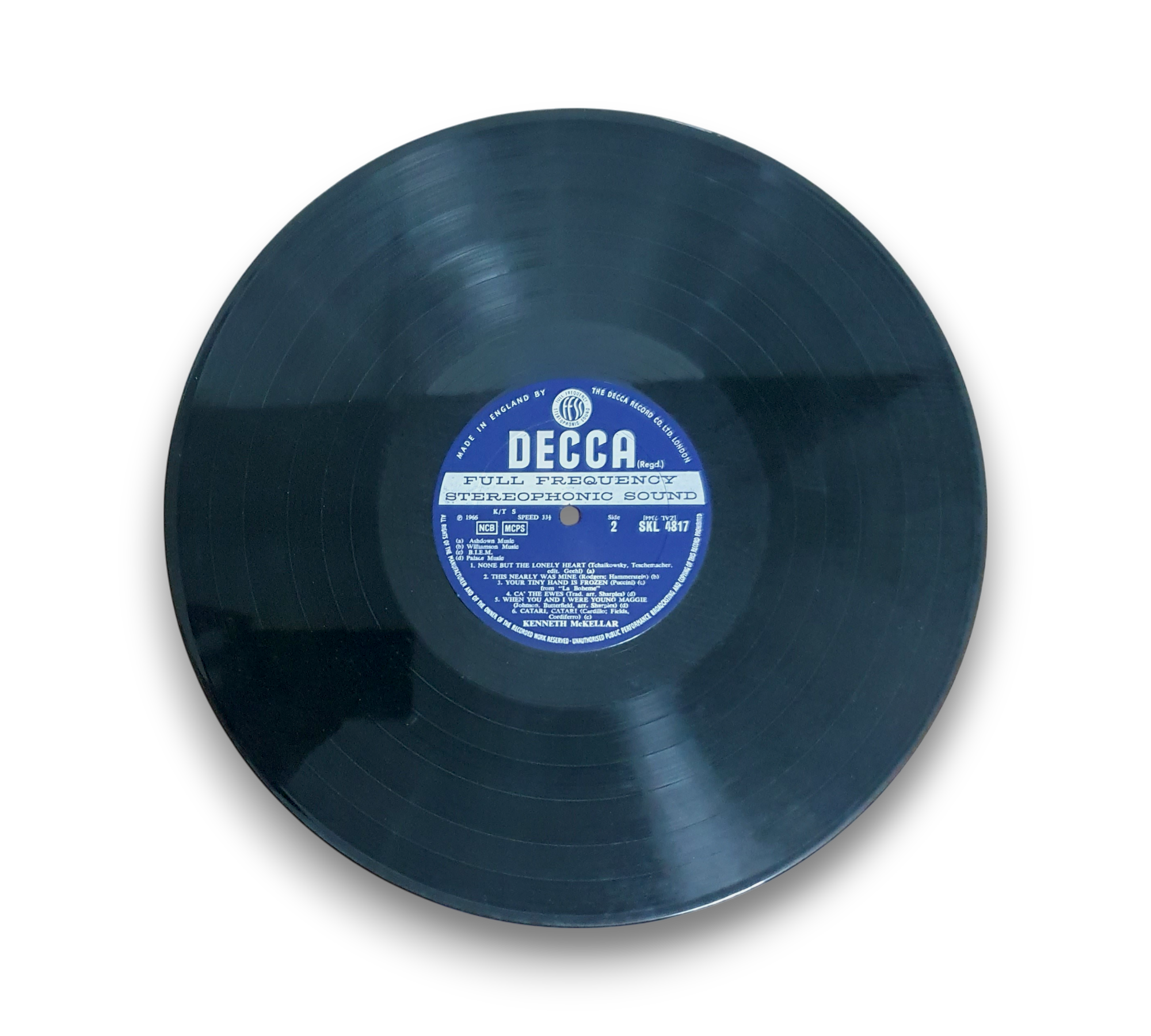 This listing features "Great Love Songs" by Kenneth McKellar, presented on grooved blue and silver unboxed labels. The top rim text indicates it was made in England by The Decca Record Co. Ltd., London. For further details regarding the condition and any included packaging, please refer to the accompanying photos.