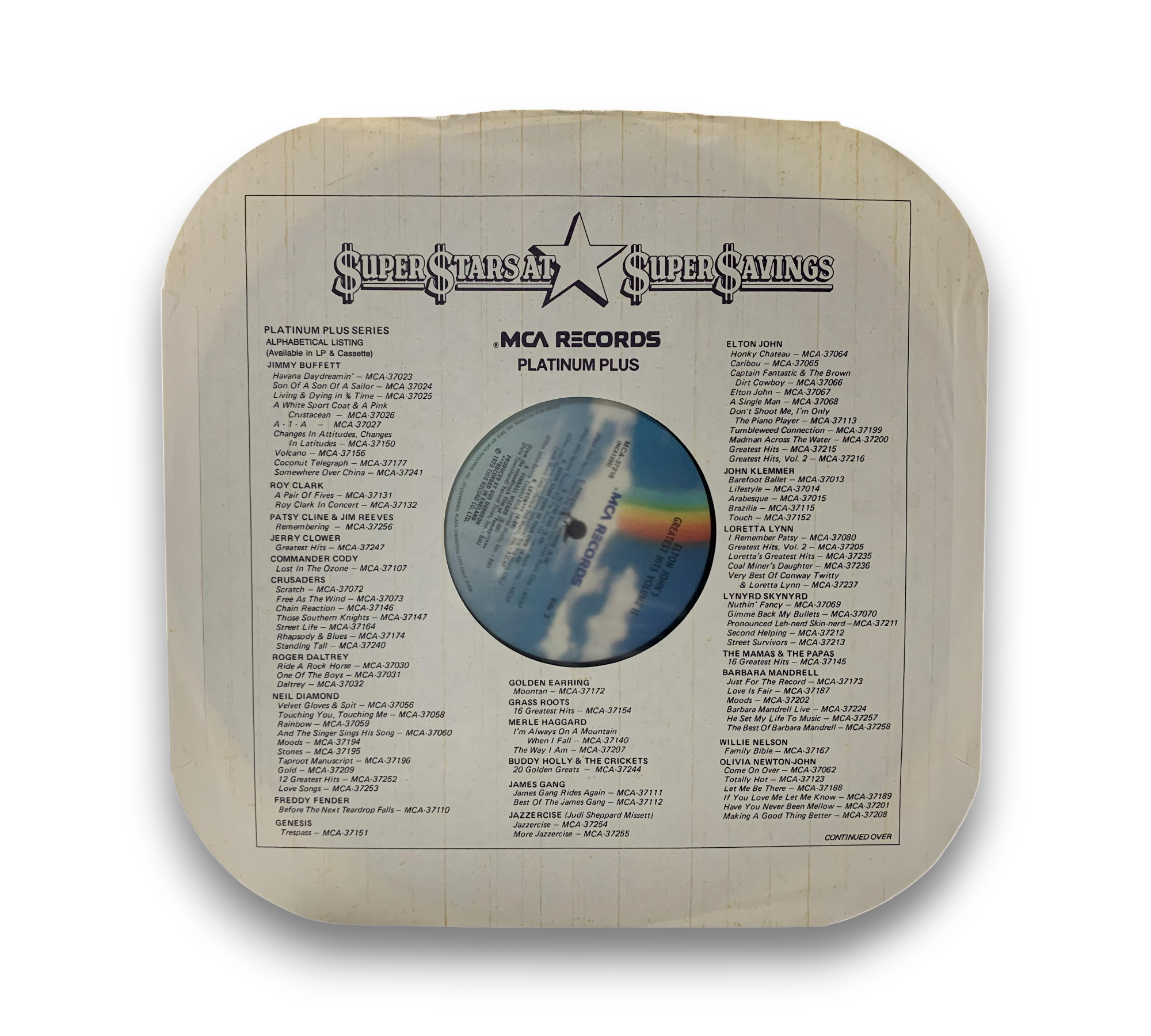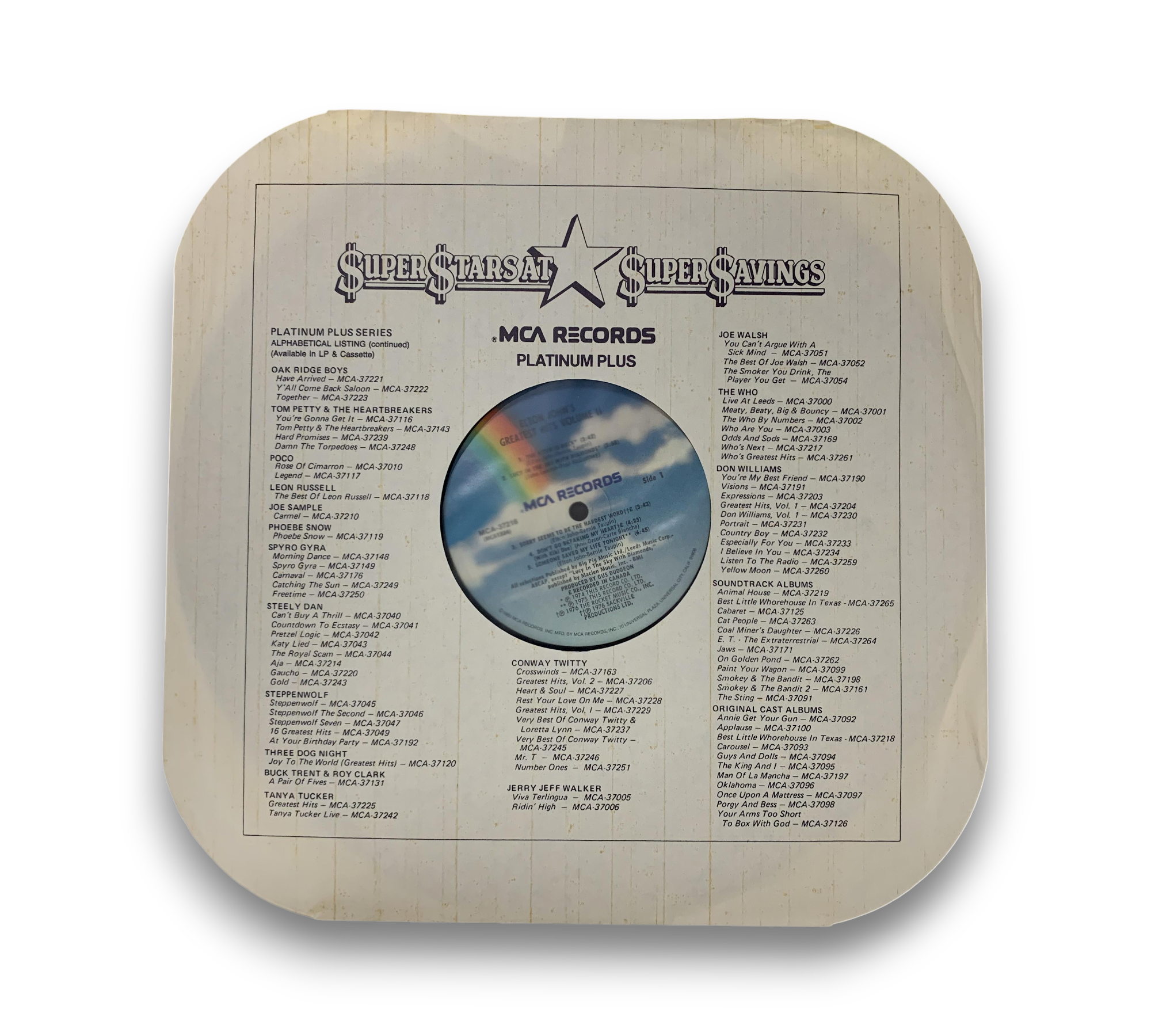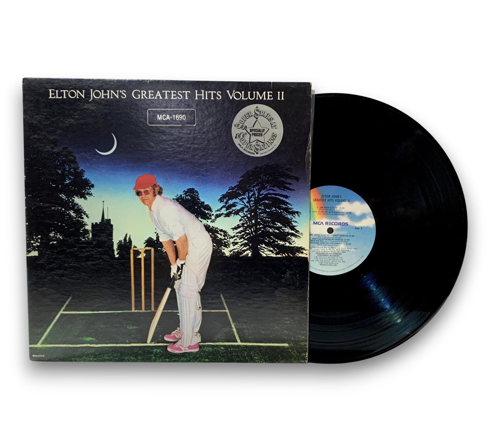 This listing features the "Super Stars At Super Prices" pressing of Elton John's "Greatest Hits Volume II," identified by the MCA-1690 catalog number. The front cover showcases a printed grey circle with the "$uper $tars At $uper $avings" logo, while the rear cover does not display a UPC barcode. The LP is housed in a catalog inner sleeve featuring reissue titles. Please refer to the accompanying photos for a detailed view of the packaging and condition, as some covers may also be gold stamped with a different number (MCA-1690).