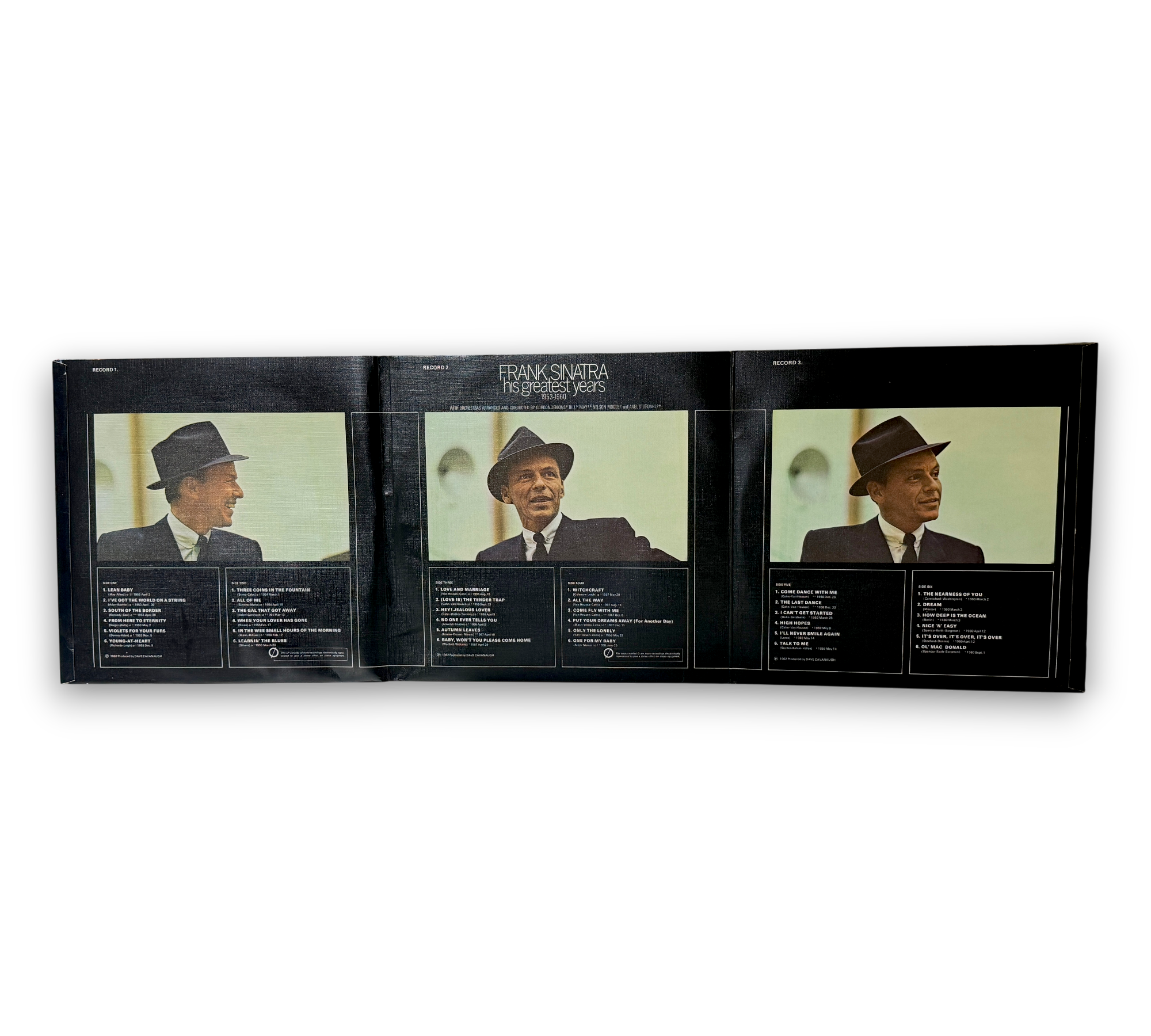 This listing features Frank Sinatra's "His Greatest Years," a reimagined version of the original 1962 release. The record is presented in a six-sided fold-out cover with a textured finish, and the three LPs are adorned with yellow labels. The runout matrices differ from similar editions, and the labels indicate it was made by The Gramophone Company Limited in Great Britain. For specific details regarding packaging and inserts, please refer to the accompanying photos.