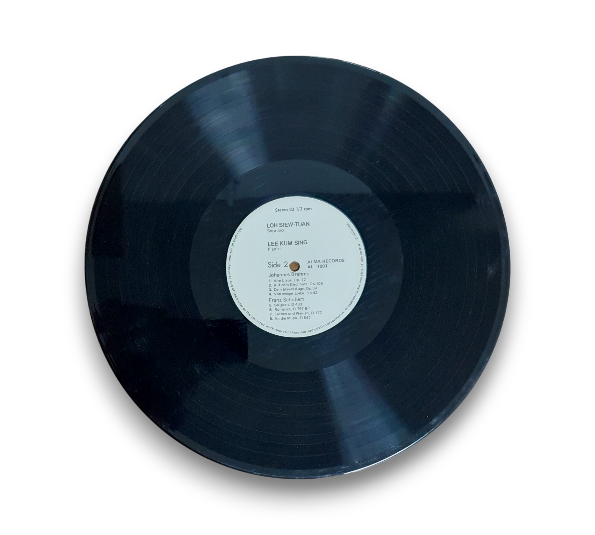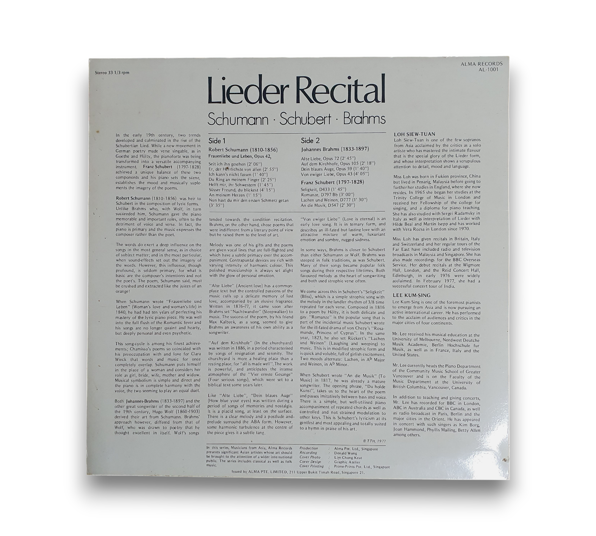 This debut release from Singaporean label Alma Records is part of their "Musicians from Asia Series." The album features a Lieder recital with works by Schumann, Schubert, and Brahms, performed by soprano Loh Siew-Tuan and pianist Lee Kum-Sing. The record showcases a blend of classical artistry and cultural representation, highlighting the talents of these musicians. For further details regarding the packaging and inserts, please refer to the accompanying photos.