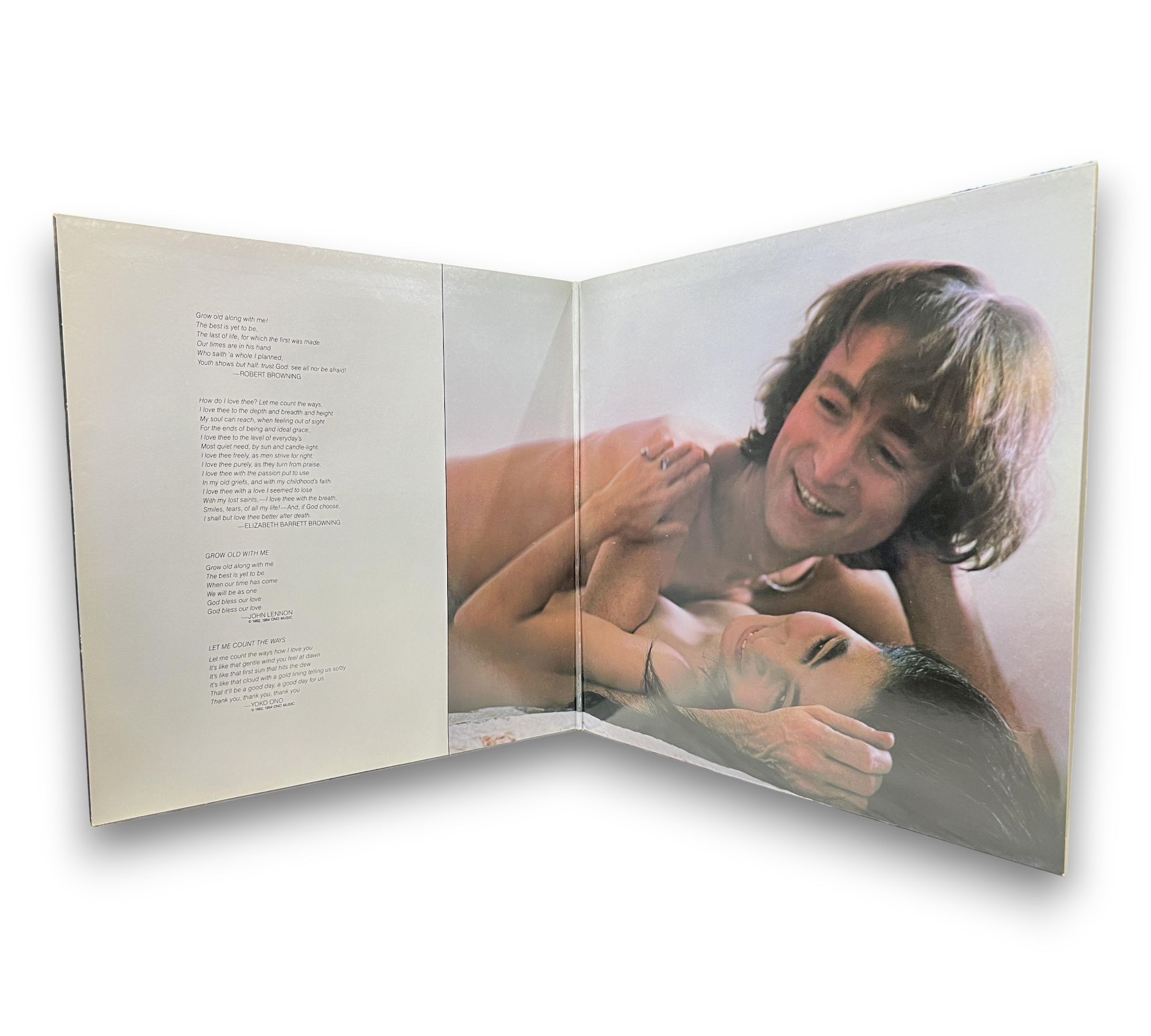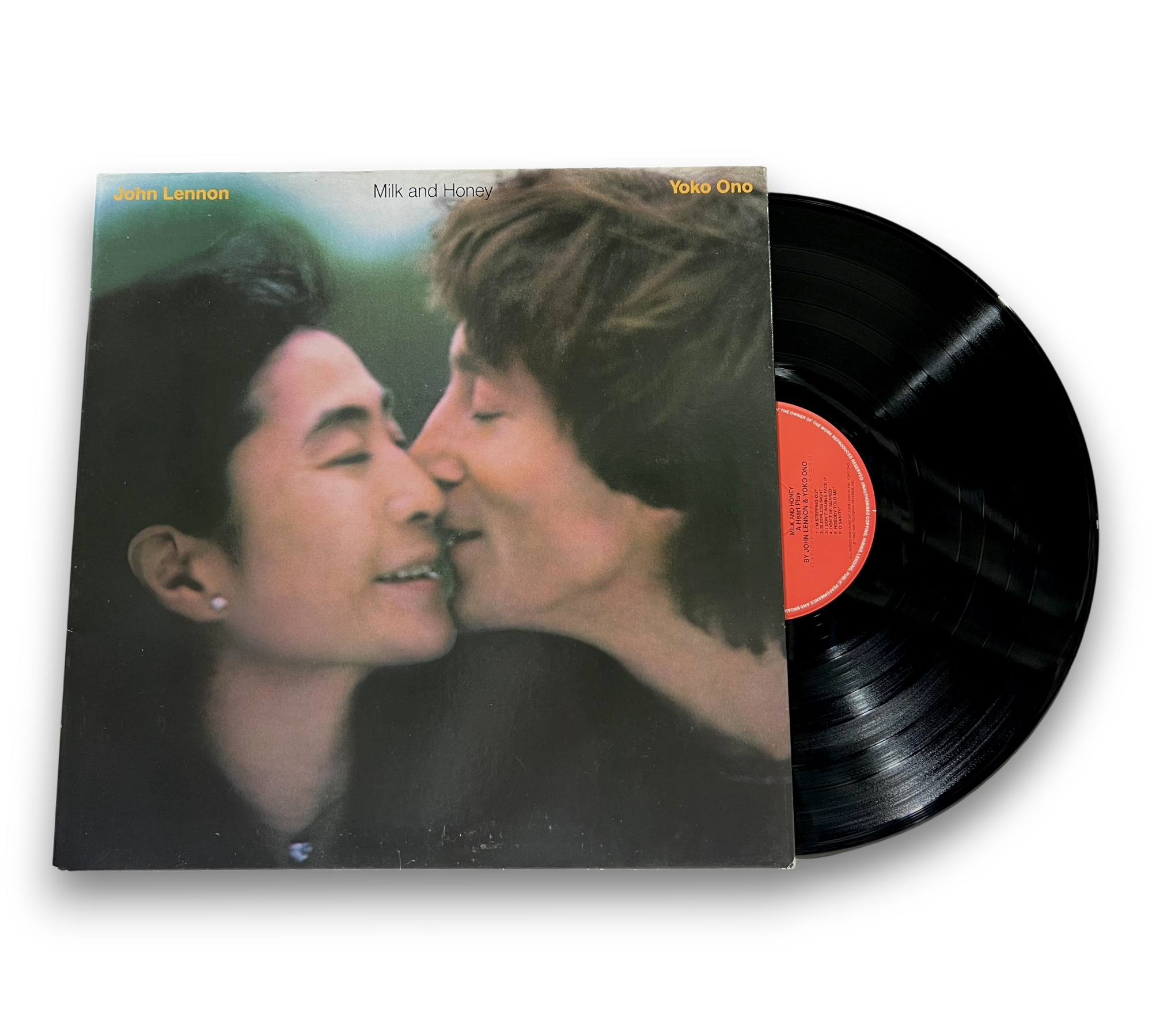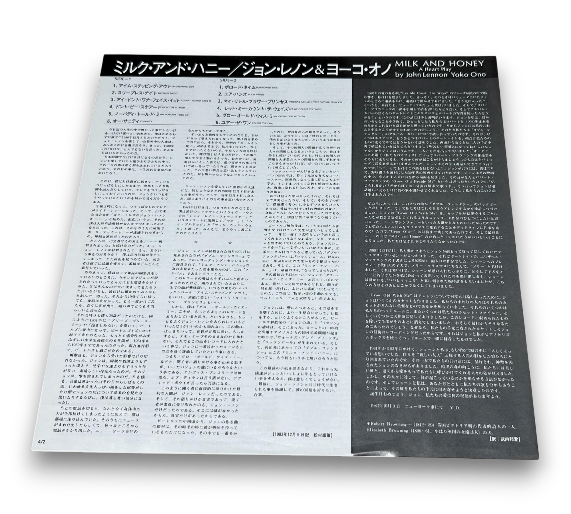 This listing features "Milk and Honey" by John Lennon and Yoko Ono, presented in a gatefold sleeve. The album includes a 4-page Japanese/English lyrics insert, which is visible in the accompanying images. The recording was produced in various studios, including Hit Factory and A and R Studios in New York, as well as The Automatt in San Francisco. Notably, the tracks “Grow Old With Me” and “Let Me Count The Ways” originate from original cassette recordings by John and Yoko. For further details regarding the packaging and inserts, please refer to the provided photos.