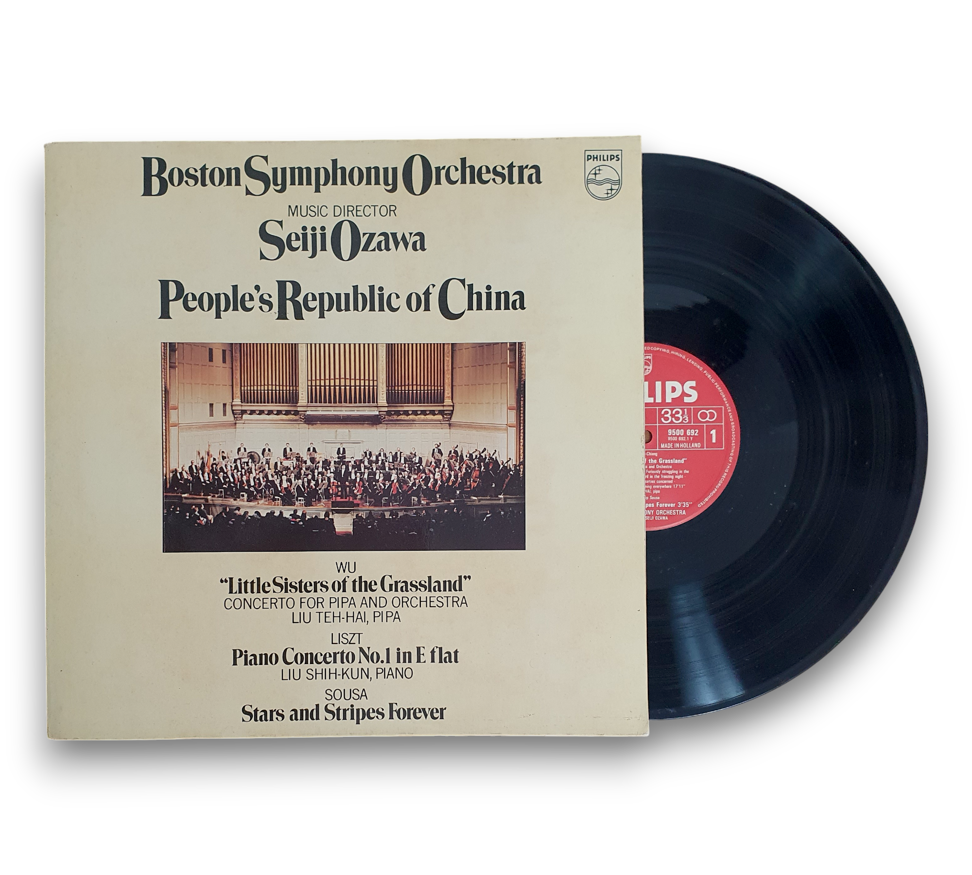 Experience the captivating sounds of the Boston Symphony Orchestra, conducted by Seiji Ozawa, in this 1979 vinyl release from the Netherlands. Featuring a diverse selection of works, including Wu Tsu-Chiang's "Little Sisters of the Grassland," Liszt's Piano Concerto No. 1 in E flat, and Sousa's iconic "Stars and Stripes Forever," this album showcases the orchestra's exceptional talent. The gatefold sleeve includes insightful notes by Marc Mandel, making it a valuable addition for classical music enthusiasts.
