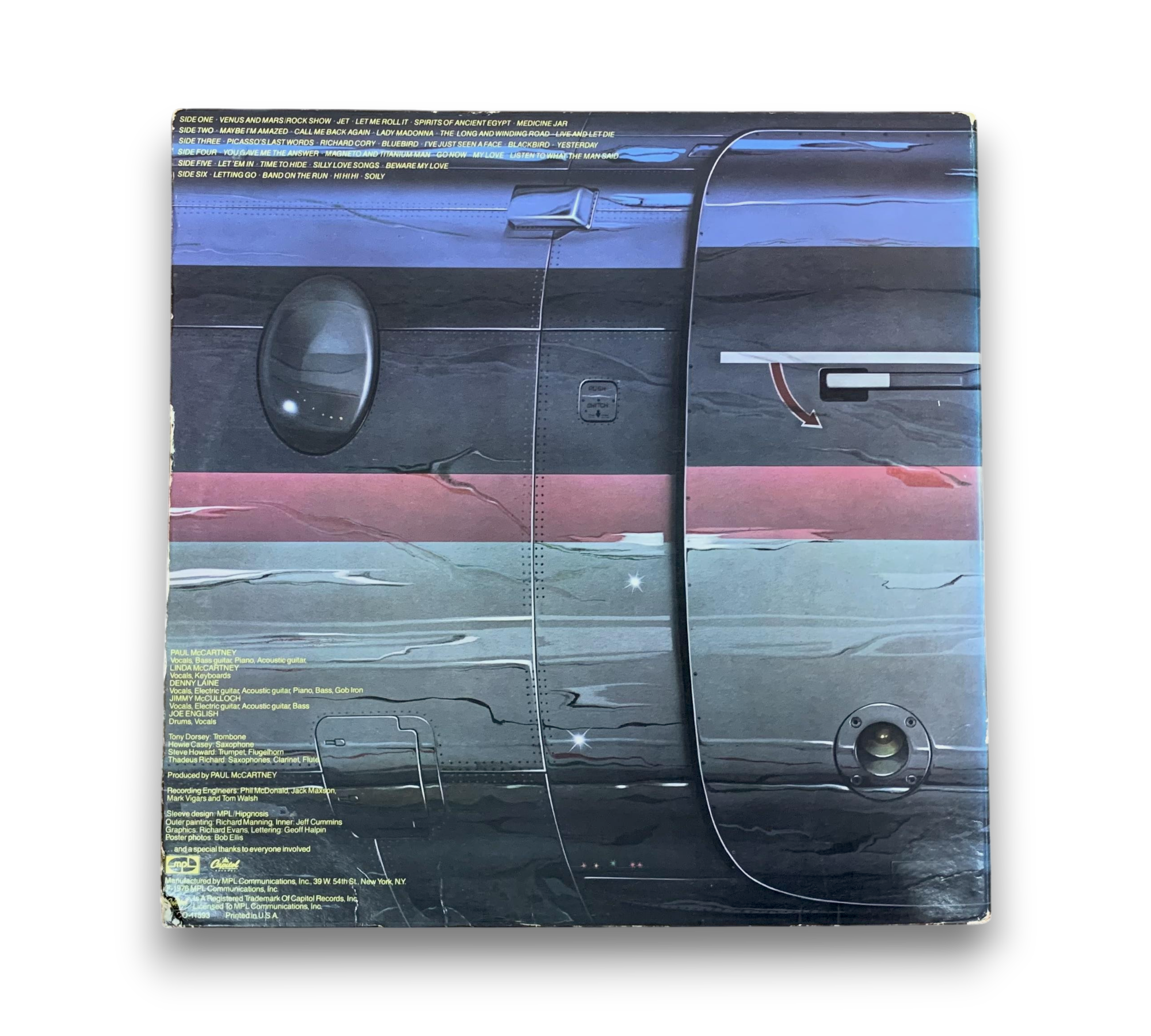 This listing features the original pressing of the album, identifiable by the "0" stamp in the runouts and the lacquer "G" suffix runout variation. The jacket showcases four "lights" at the bottom right front corner, consistent with one of the three available art versions. It is issued in a gatefold jacket, accompanied by custom color labels and graphic inner sleeves. While the listing mentions a large folded 20"x 30" dual-sided color poster, please refer to the accompanying photos for confirmation of included items and overall condition. Manufactured by MPL Communications, Inc. and printed in the USA.