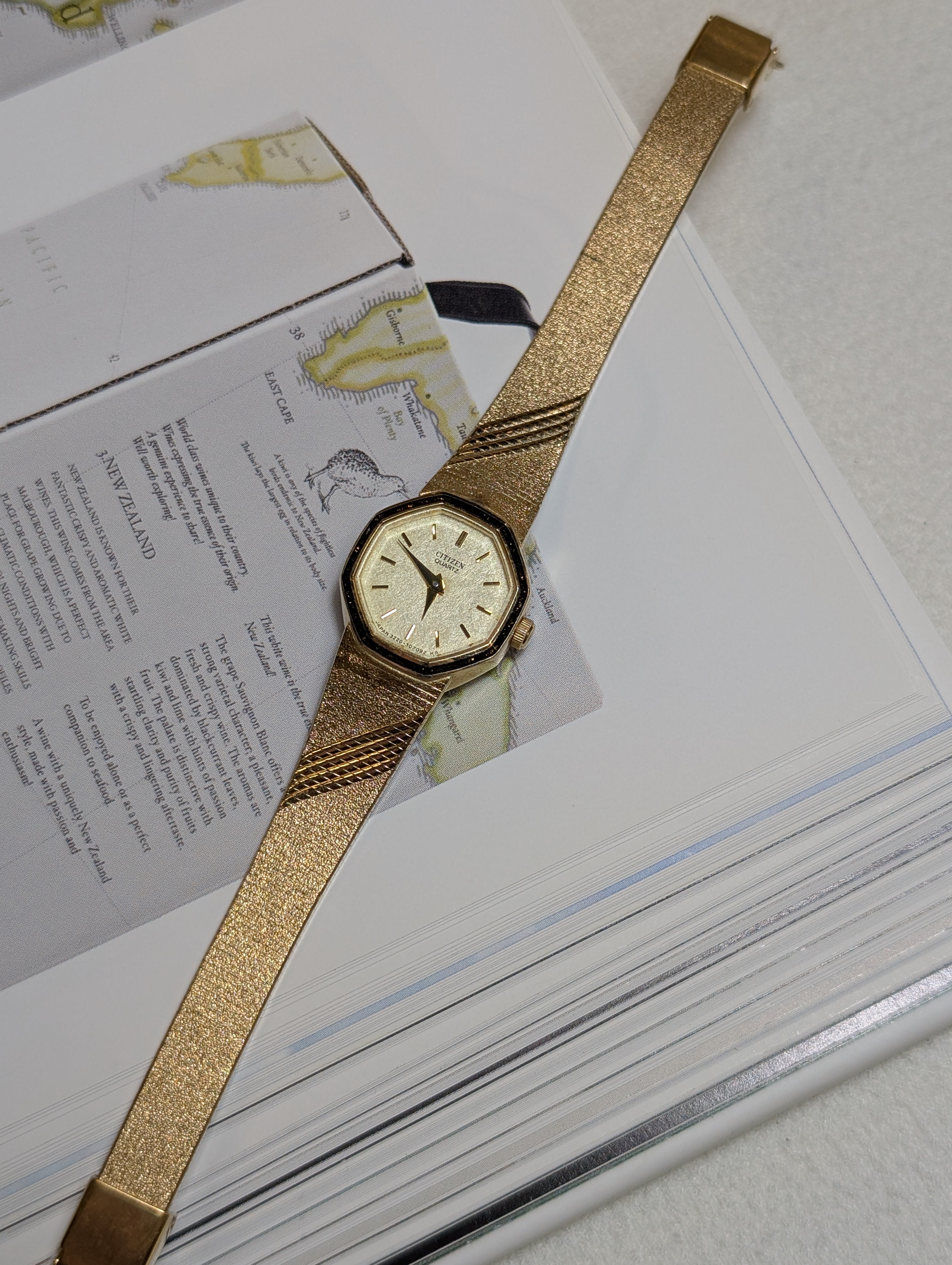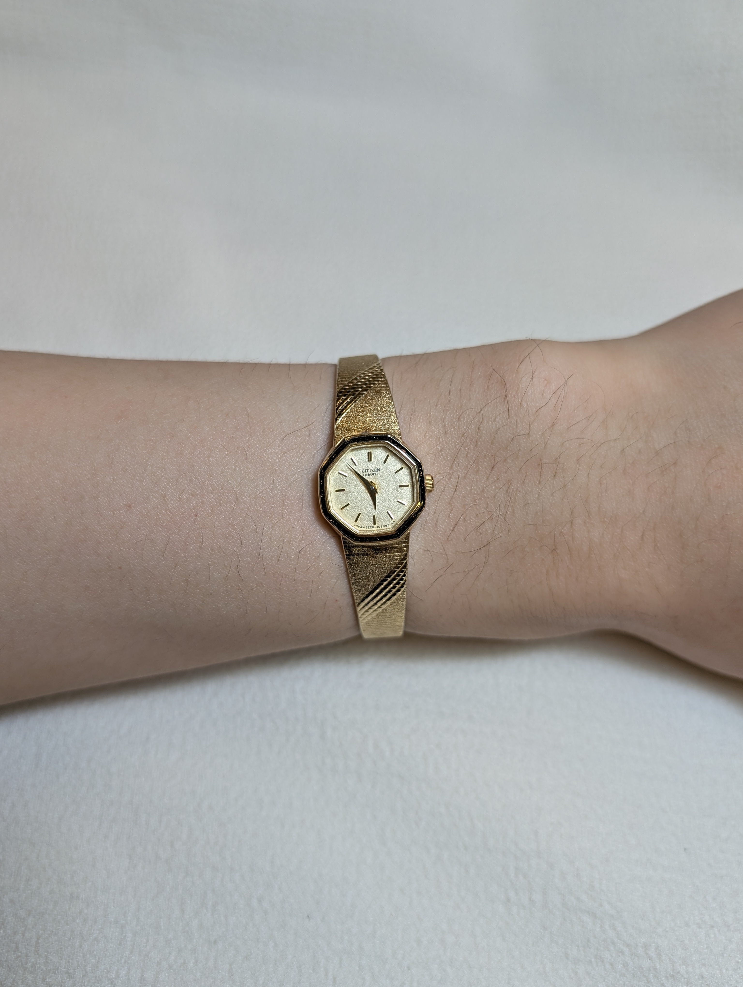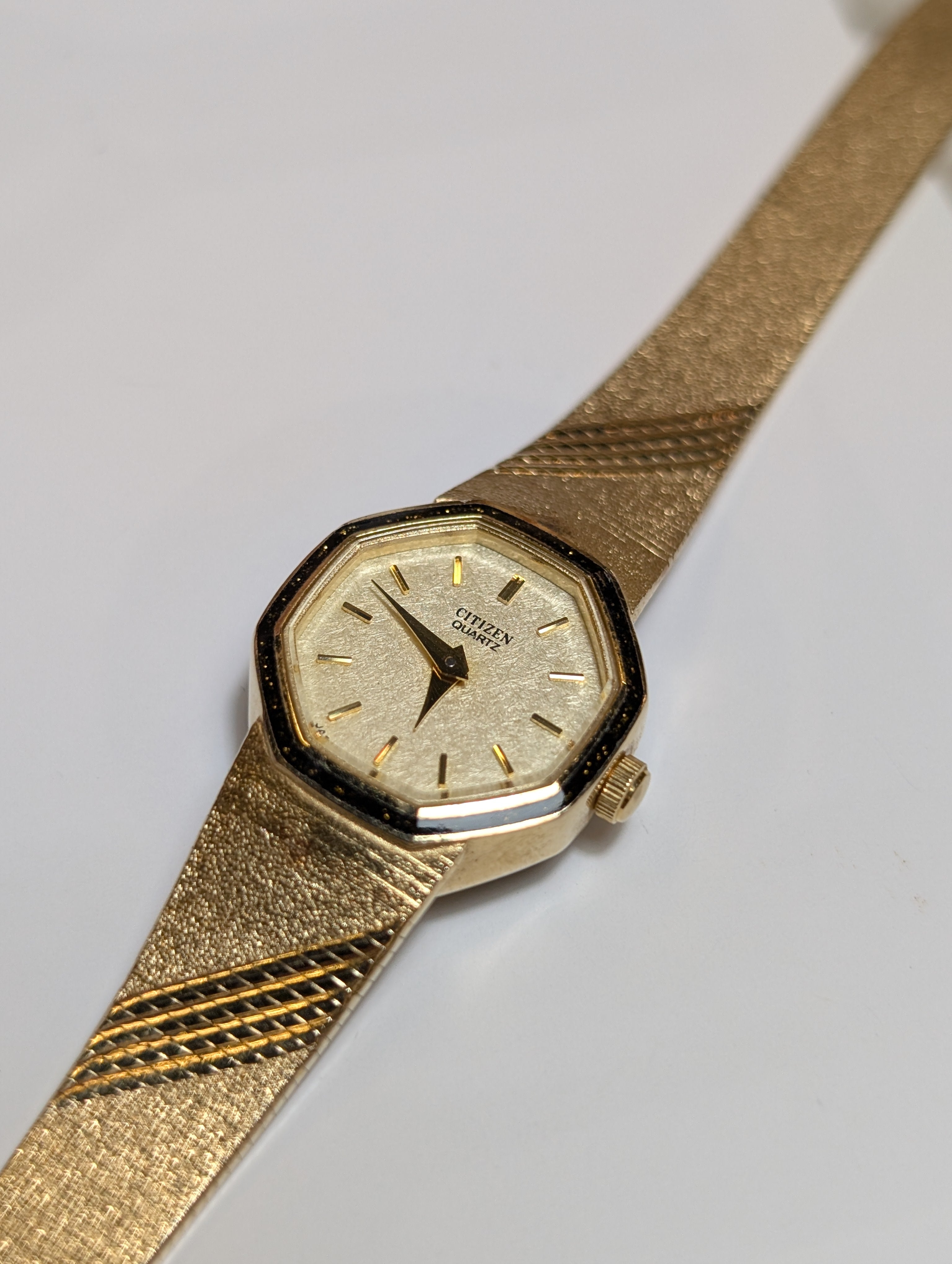 Enhance your wristwear collection with this Vintage Citizen Quartz Gold-Tone Octagonal Bracelet Watch. This unisex analog watch stands out with its unique octagonal case and a striking textured gold band detailed with diagonal lines. Powered by reliable quartz movement, it's a perfect blend of style and precision for any adult looking to make a timeless statement.