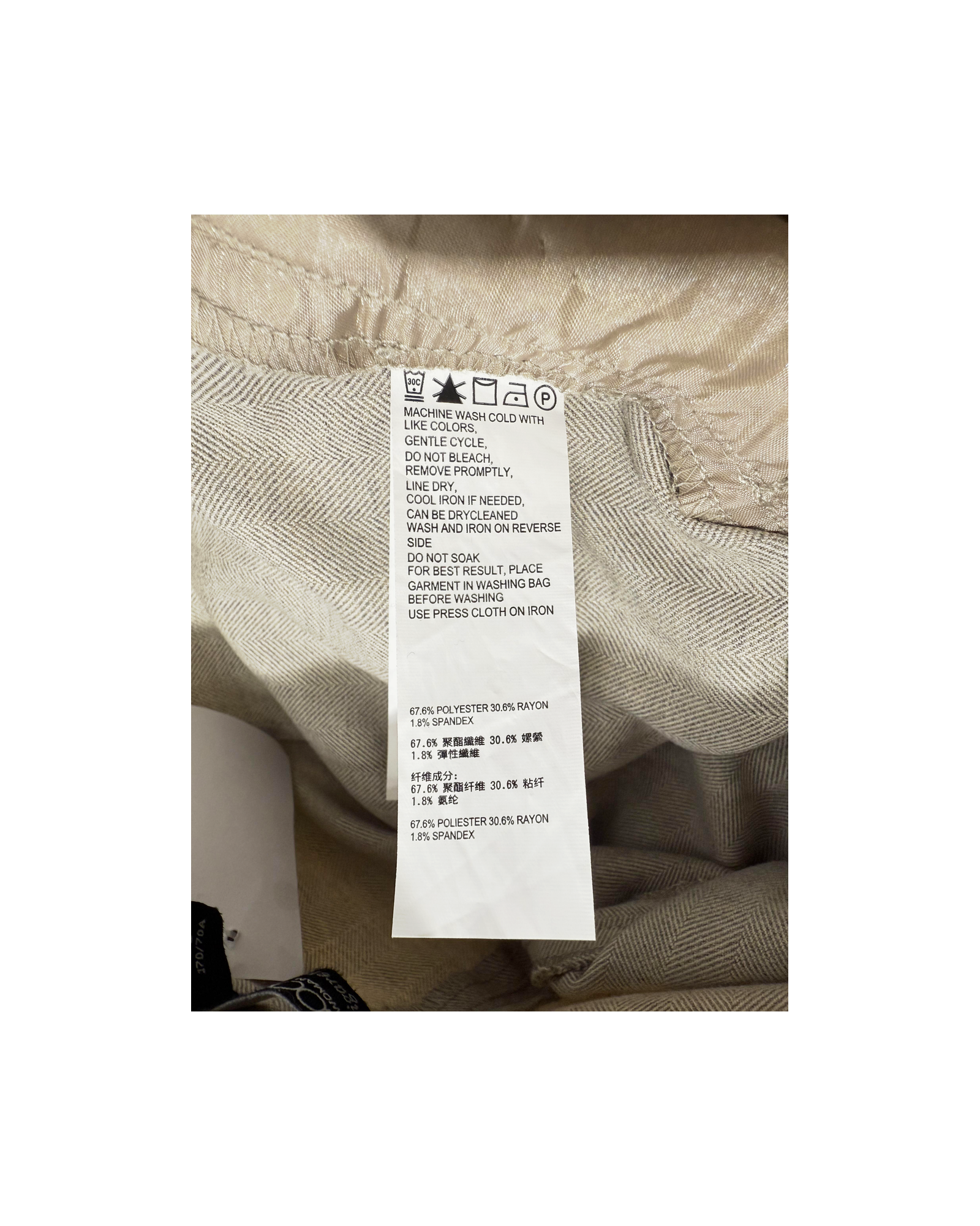 67.6% Polyester, 30.6% Rayon, 1.8% Spandex