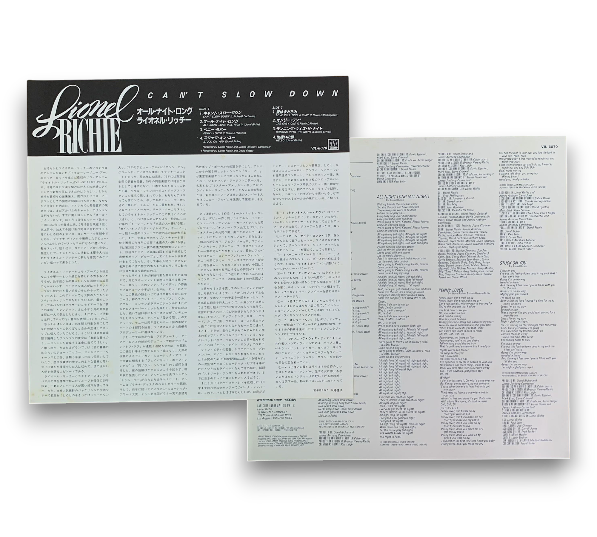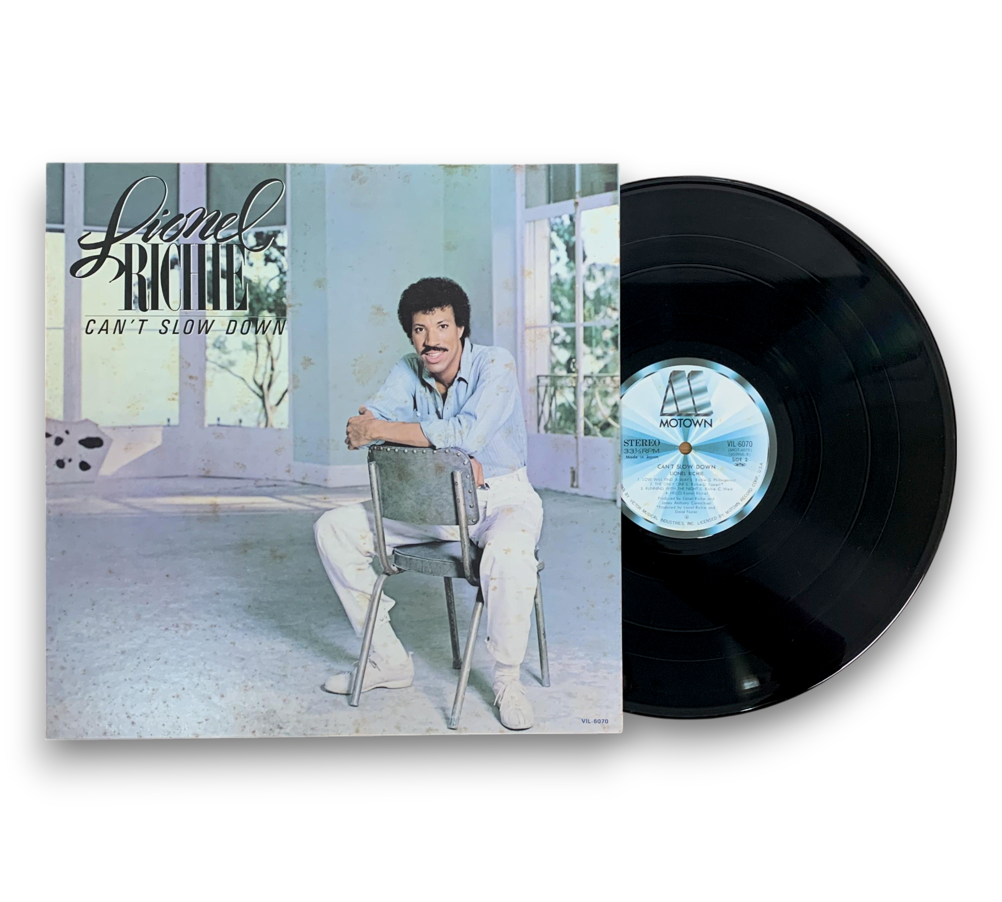 ℗1984 Motown Record Corporation, U.S.A. This edition of "Can't Slow Down" by Lionel Richie was manufactured by Victor Musical Industries, Inc. in Tokyo, Japan. The listing includes two inserts featuring lyrics in both English and Japanese. For further details regarding the packaging and inserts, please refer to the accompanying photos.