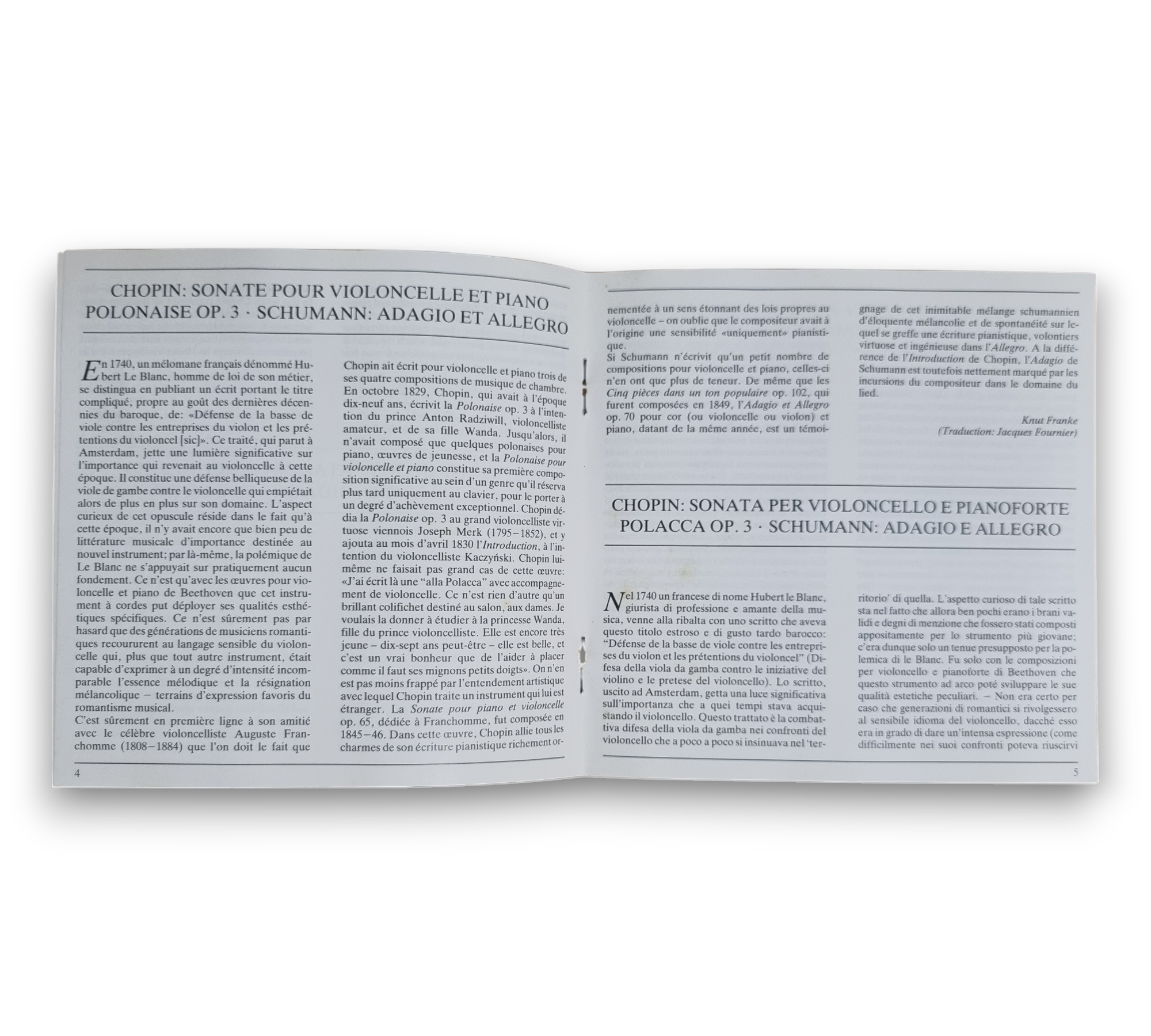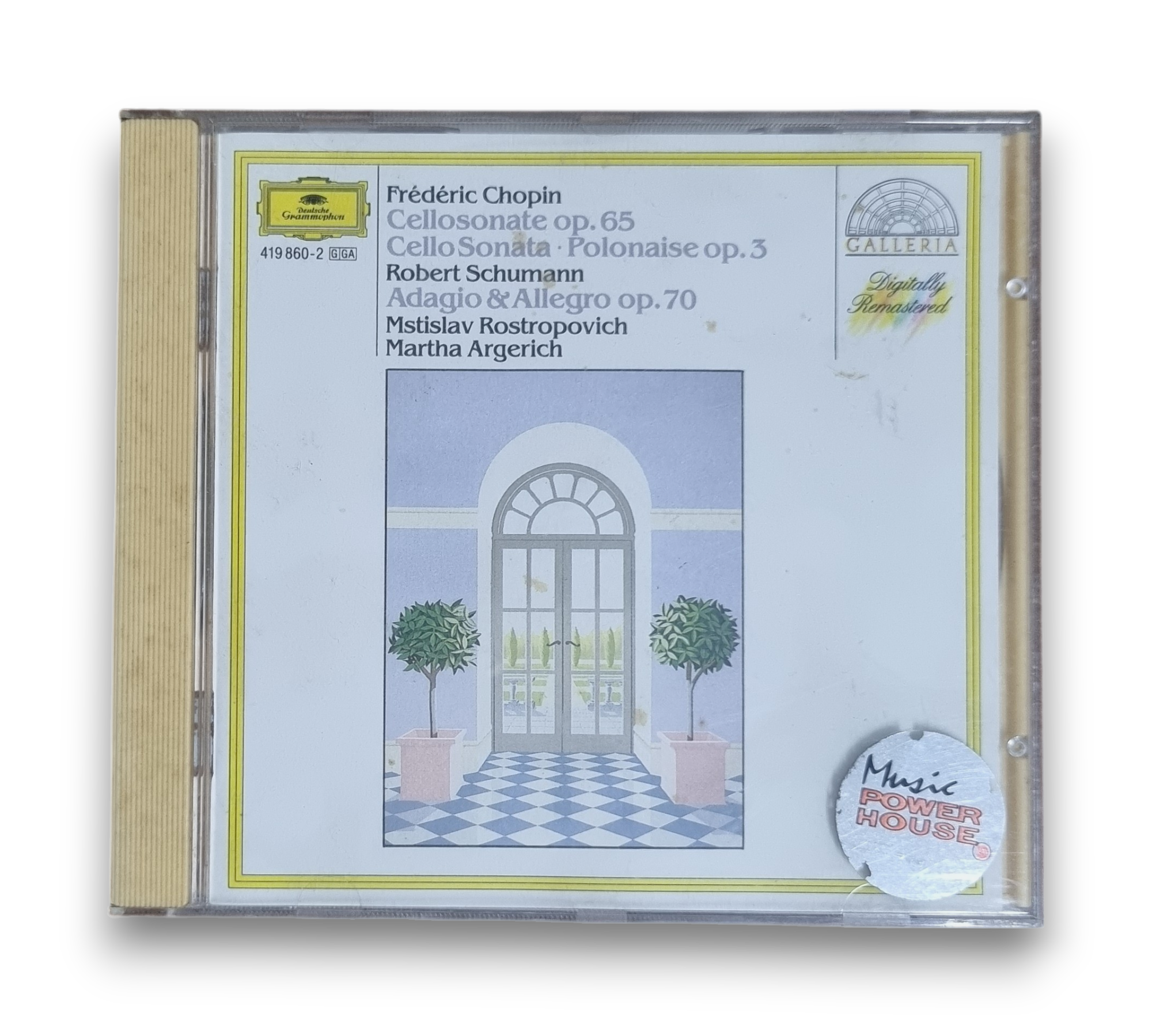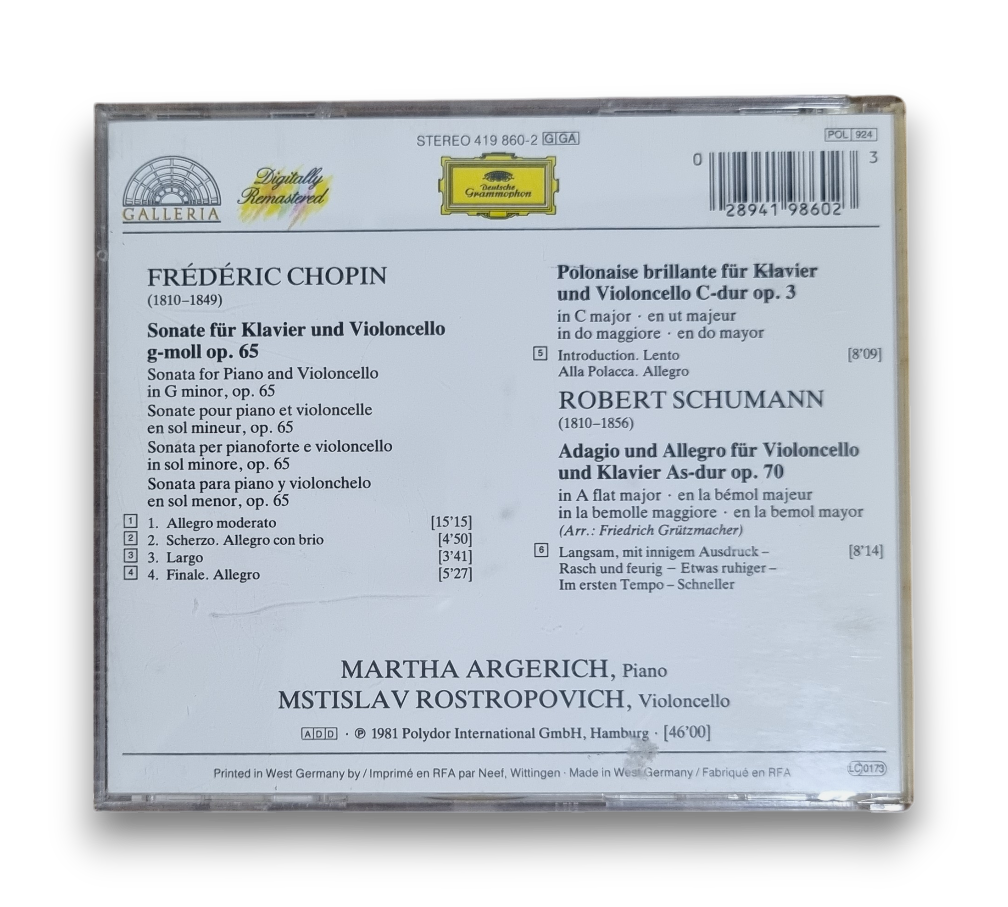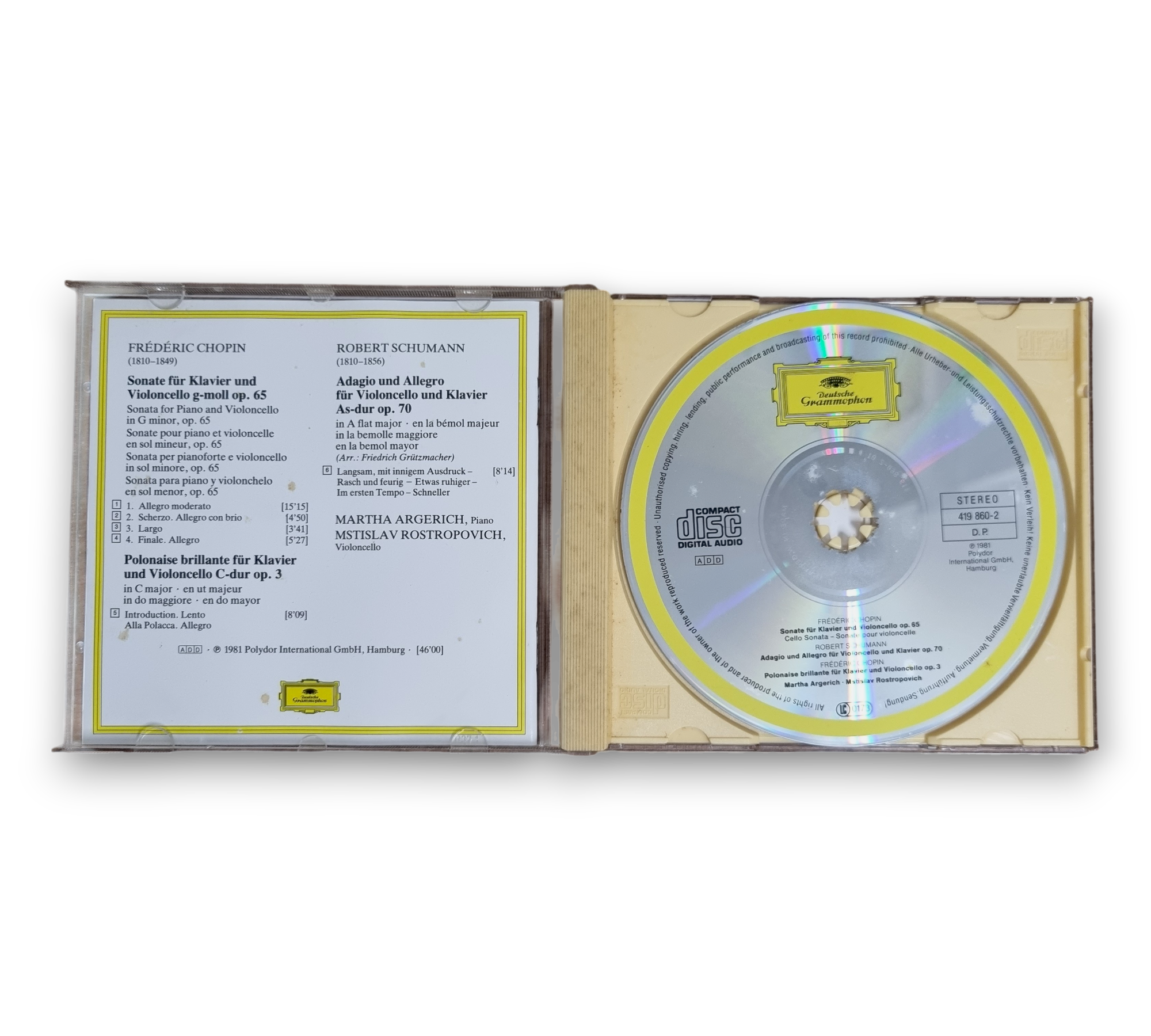 This recording features works by Frédéric Chopin and Robert Schumann, performed by renowned artists Martha Argerich on piano and Mstislav Rostropovich on cello. The recordings were made in March 1980 at the Herkules-Saal in München. The CD includes a composition insert with notes that provide additional context about the pieces. For further details regarding the packaging and inserts, please refer to the accompanying photos.