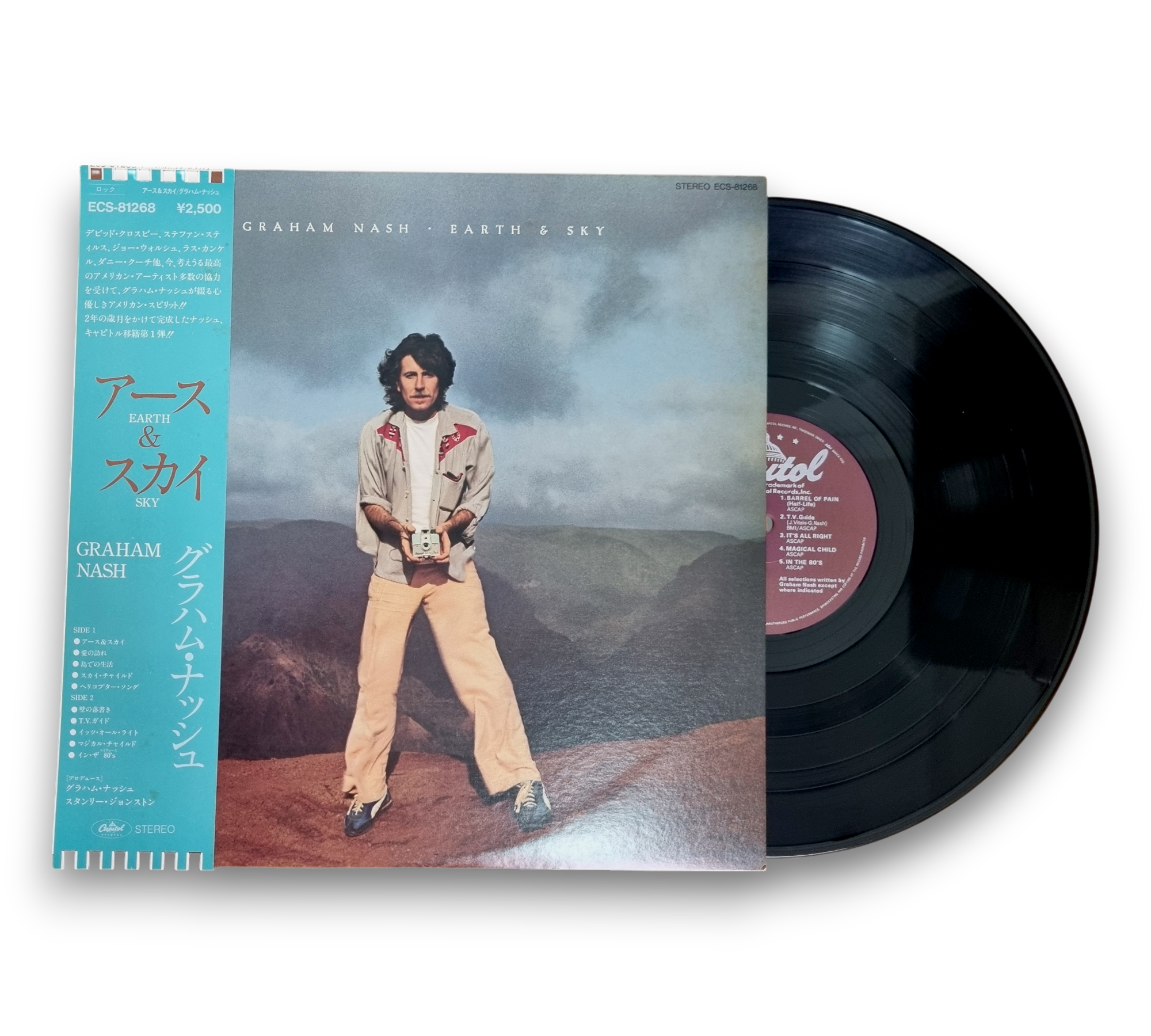 ℗1980 Capitol Records, Inc. This record, "Earth & Sky" by Graham Nash, was manufactured by Toshiba-EMI Ltd. in Japan. The album features contributions from notable artists, including Joe Vitale, Joe Walsh, and Jackson Browne, who appear courtesy of Asylum Records, as well as Stephen Stills, Leah Kunkel, and Steve Lukather from Capitol Records. Nicolette Larsen is featured courtesy of Warner Bros. Records, Inc. Please refer to the accompanying photos for details regarding the inner sleeve and any additional packaging.