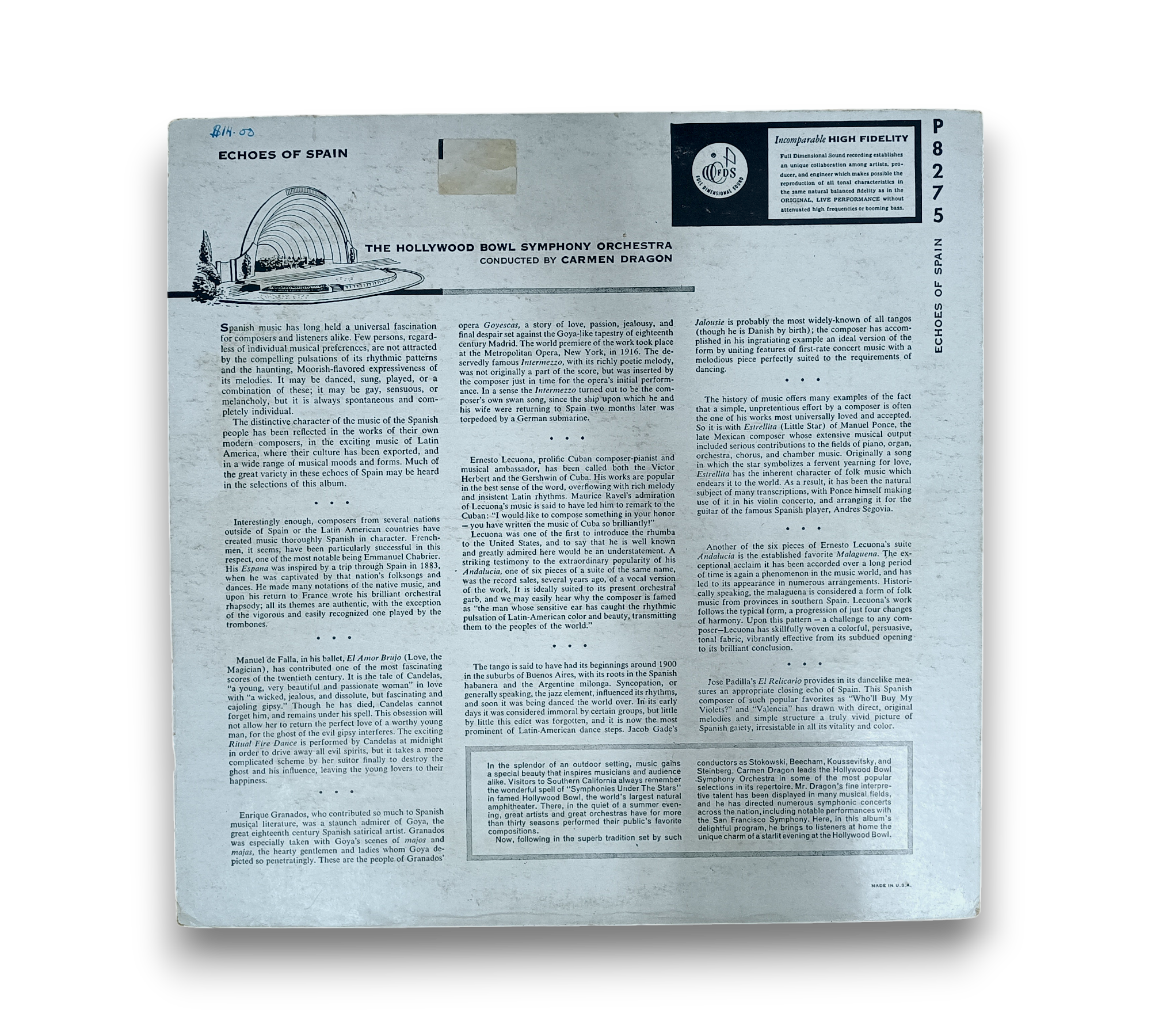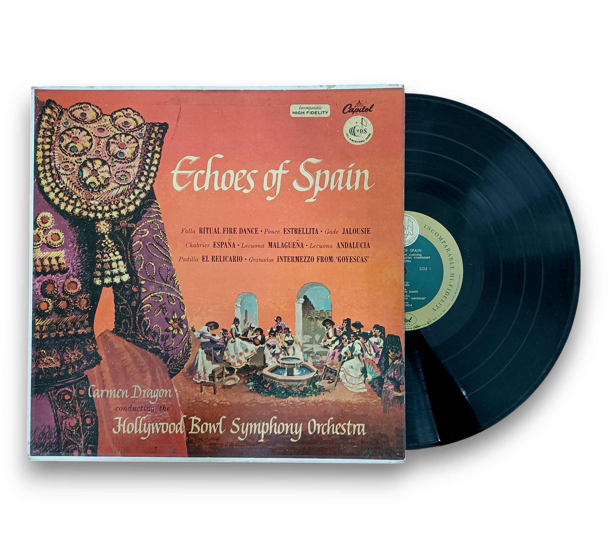 Experience the enchanting sounds of "Echoes Of Spain," a captivating 1955 vinyl release featuring the masterful Carmen Dragon and The Hollywood Bowl Symphony Orchestra. This album beautifully blends Latin and classical styles, showcasing exquisite tracks such as "España," "Ritual Fire Dance," and "Malagueña." A must-have for lovers of modern orchestral music, this record transports listeners to the heart of Spanish culture through its rich melodies and vibrant arrangements.
