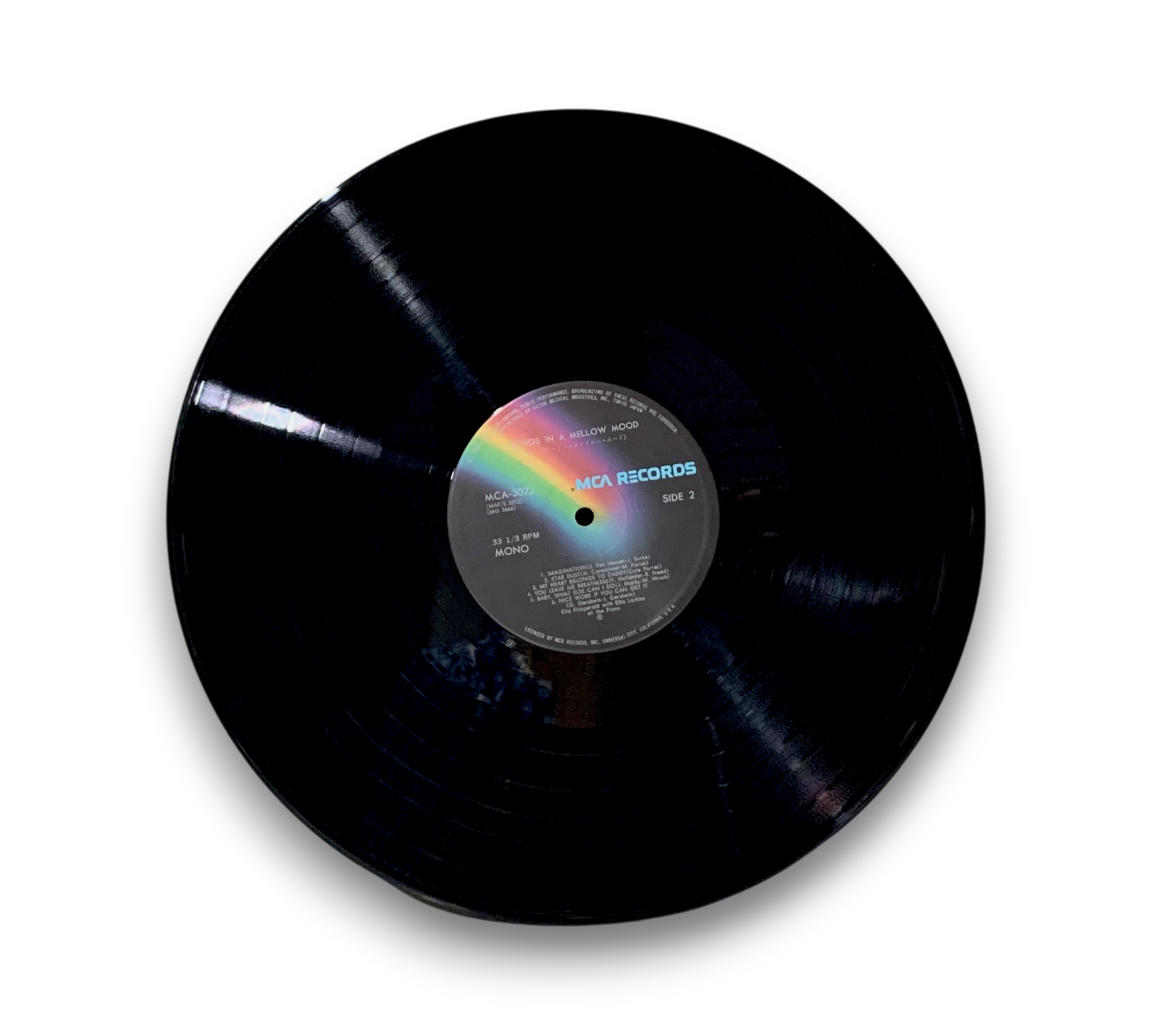 This listing features "Songs in a Mellow Mood" by Ella Fitzgerald, accompanied by Ellis Larkins on piano. The record is pressed on black rainbow MCA labels and includes a lyric insert. For further details regarding the condition and specific packaging elements, please refer to the accompanying photos.