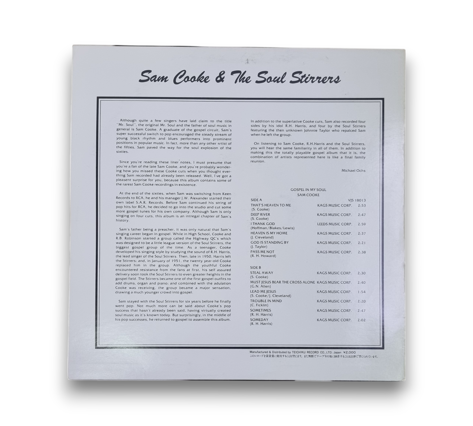 Experience the soulful sounds of Sam Cooke and The Soul Stirrers with "Gospel In My Soul," a 1984 vinyl release from Teichiku Record Co., Japan. This album features powerful tracks like "That's Heaven To Me" and "Steal Away," showcasing Cooke's remarkable vocal talent alongside the rich harmonies of The Soul Stirrers. The vinyl is in good condition, making it a wonderful addition for collectors and fans of gospel and soul music.