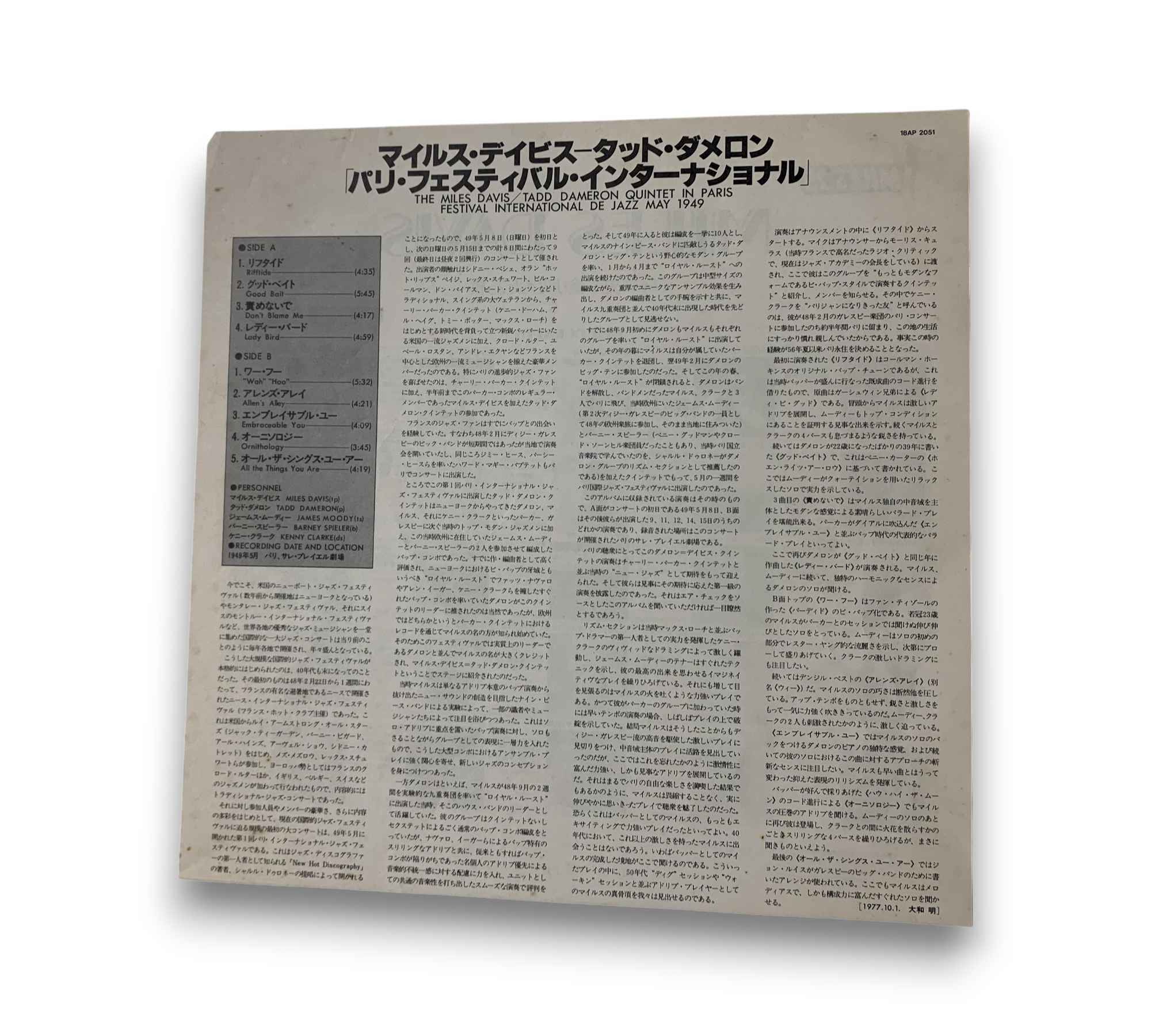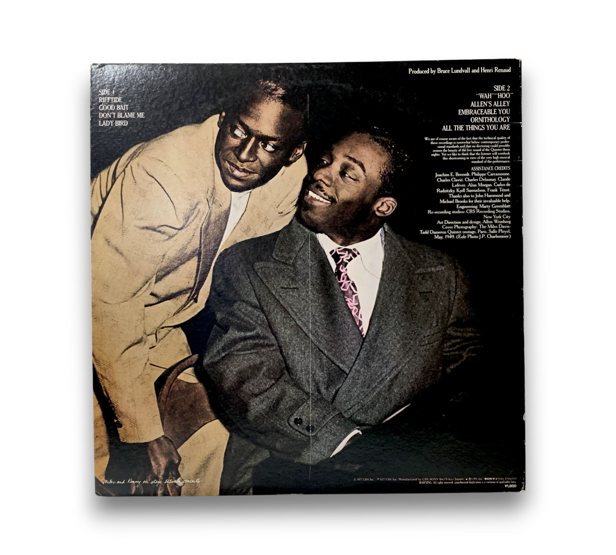 This record features a live performance by the Miles Davis/Tadd Dameron Quintet at the Paris Festival International de Jazz in May 1949. The recording was made at CBS Recording Studios in New York City and was released by CBS Inc. in 1977. The track listing includes notable pieces such as "Riff Tide," "Good Bait," and "Lady Bird." For specific details regarding packaging and inserts, please refer to the accompanying photos, as they provide the most accurate representation of the item.