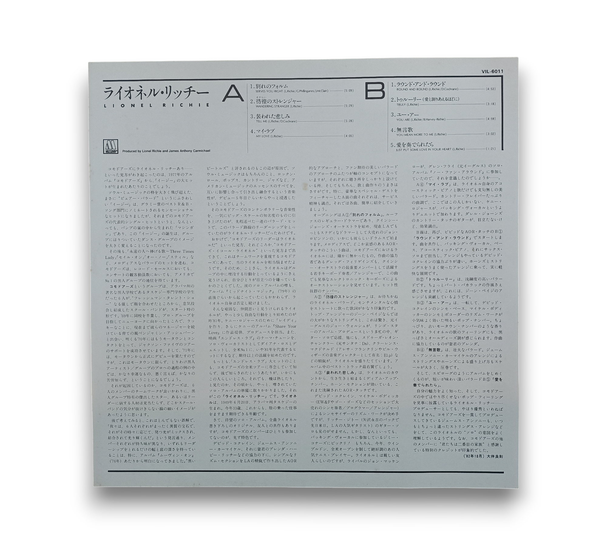 Discover the soulful sounds of Lionel Richie with this original 1982 Japan pressing of his self-titled album. Featuring a vibrant cover design and two inserts, this vinyl captures Richie's signature blend of Rhythm & Blues, Soul, and Funk. Enjoy timeless tracks like "Serves You Right," "Truly," and "You Are," showcasing his exceptional artistry. For detailed visuals of the record's condition and packaging, please refer to the accompanying photos.