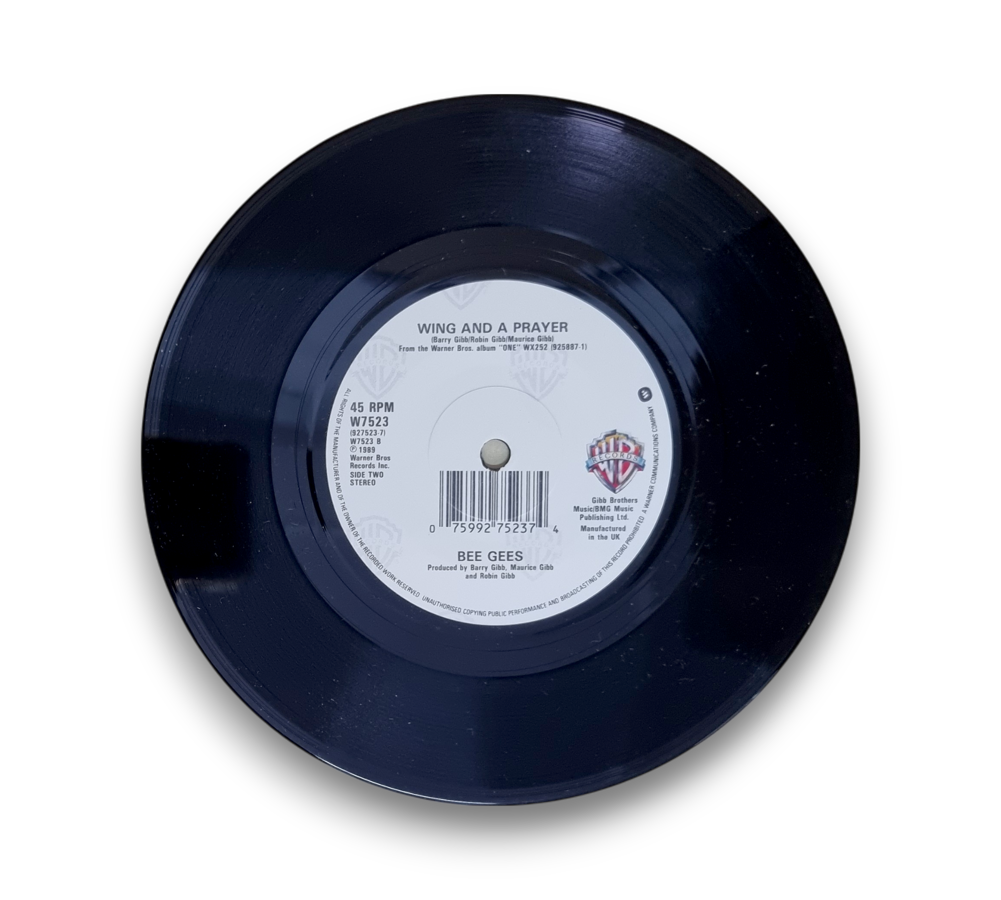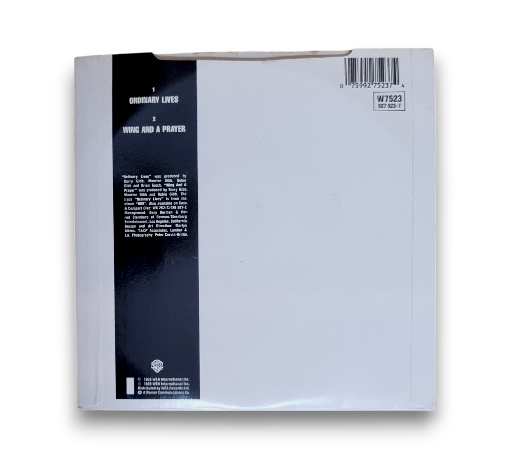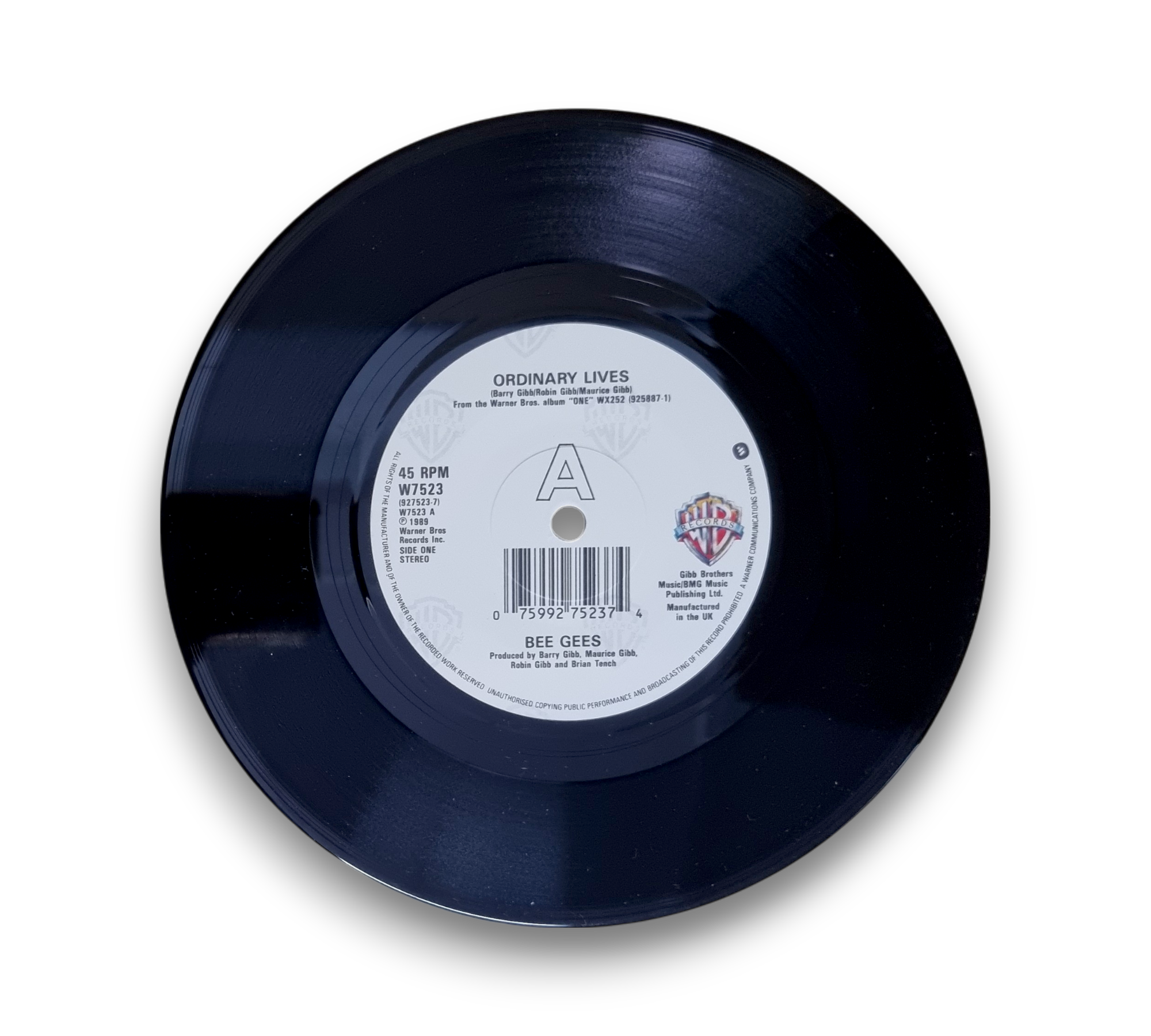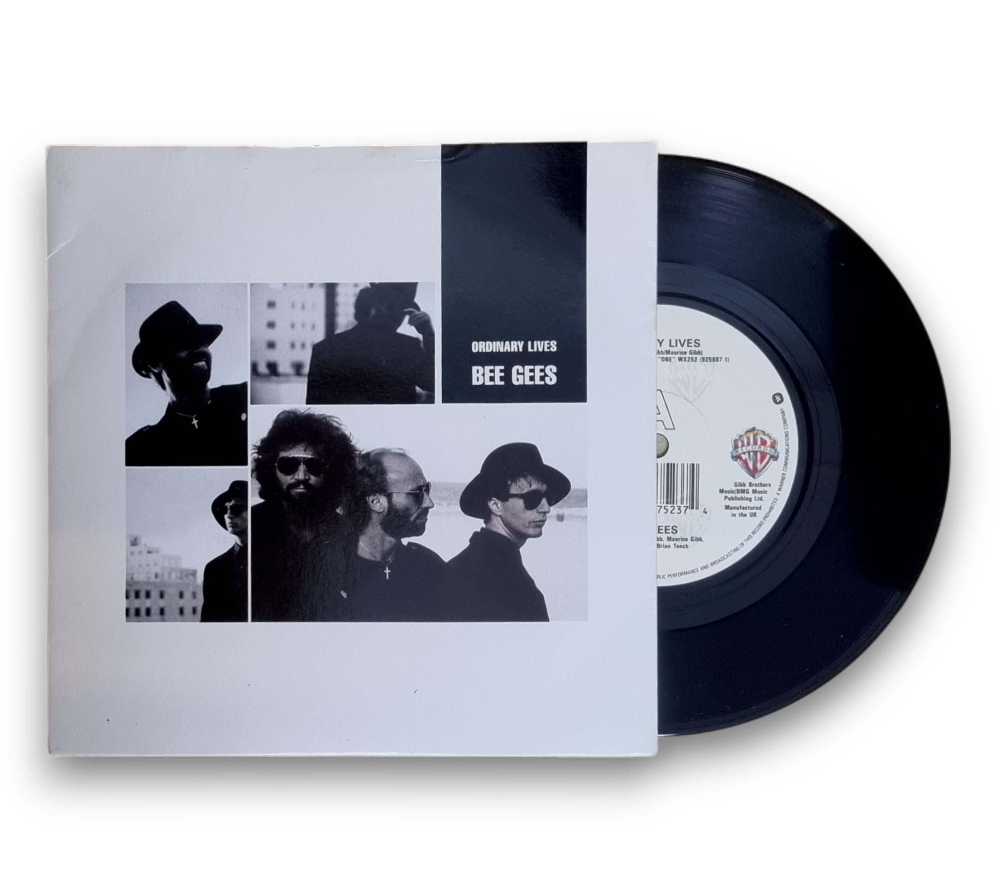 Discover the timeless sound of the Bee Gees with their 1989 single "Ordinary Lives," taken from the album "One." This UK release features two captivating tracks: the title song "Ordinary Lives" and the heartfelt "Wing and a Prayer." The vinyl is in good condition, and the accompanying images showcase the front and back cover, as well as both sides of the record. A must-have for fans of pop rock and collectors alike!