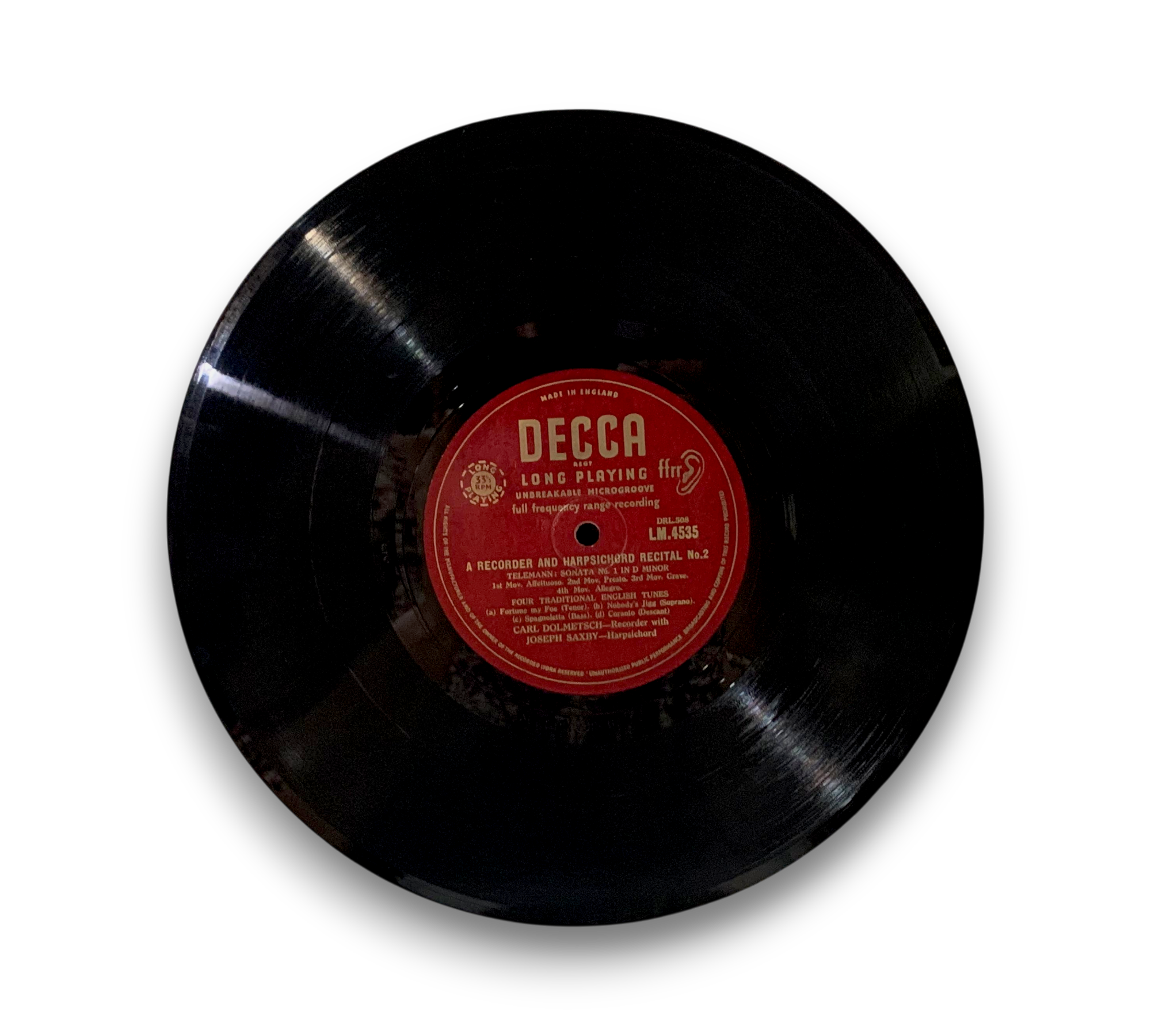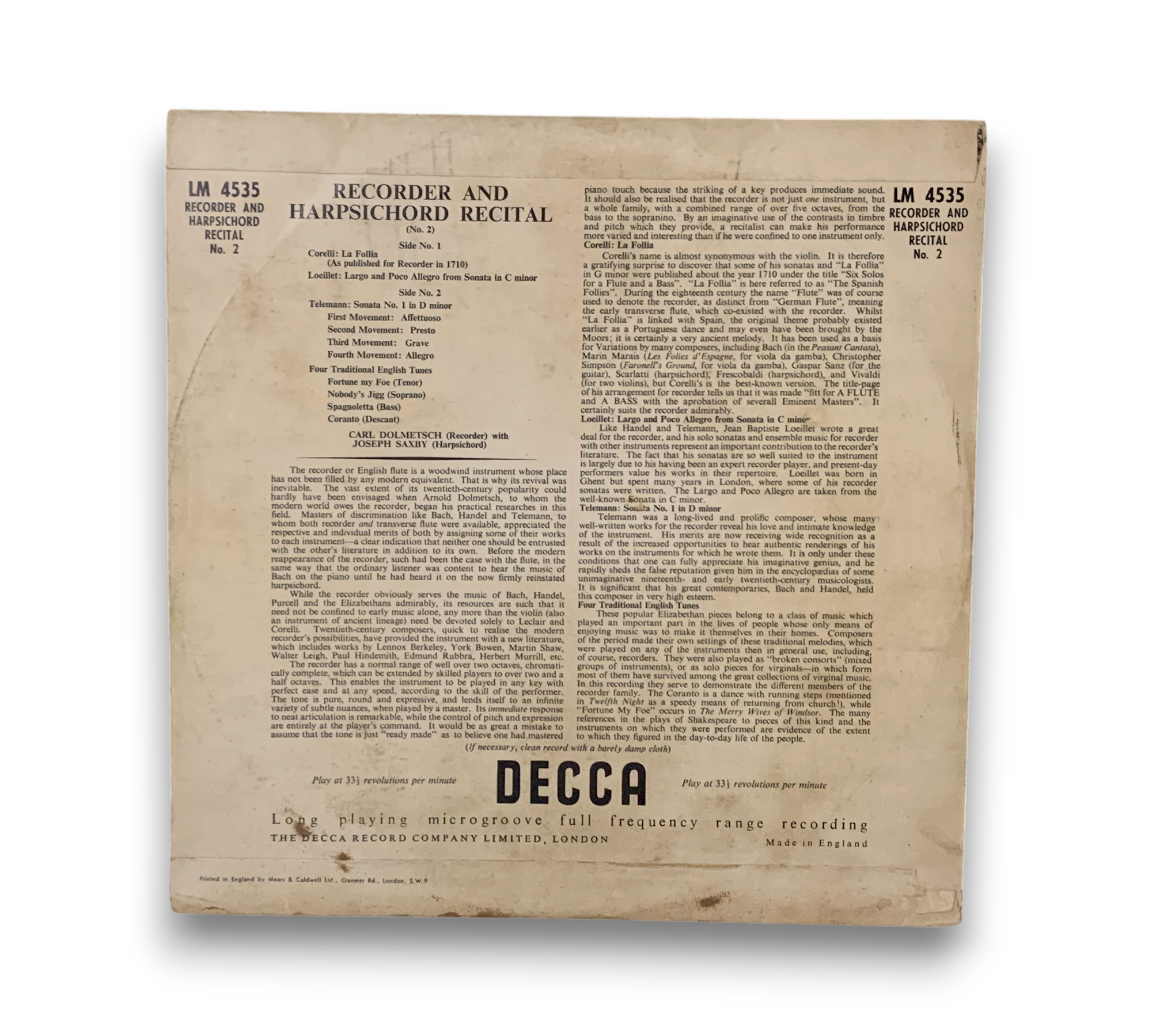 This record features "Recorder and Harpsichord Recital No. 2," performed by Carl Dolmetsch on recorder and Joseph Savy on harpsichord. The repertoire includes works by Corelli, Telemann, and traditional English tunes. The record is produced by Decca and is noted for its long-playing microgroove format. For further details regarding the condition and any included packaging, please refer to the accompanying photos.