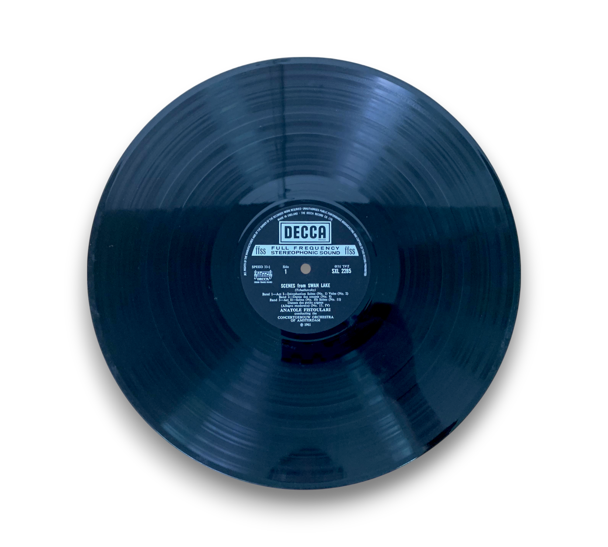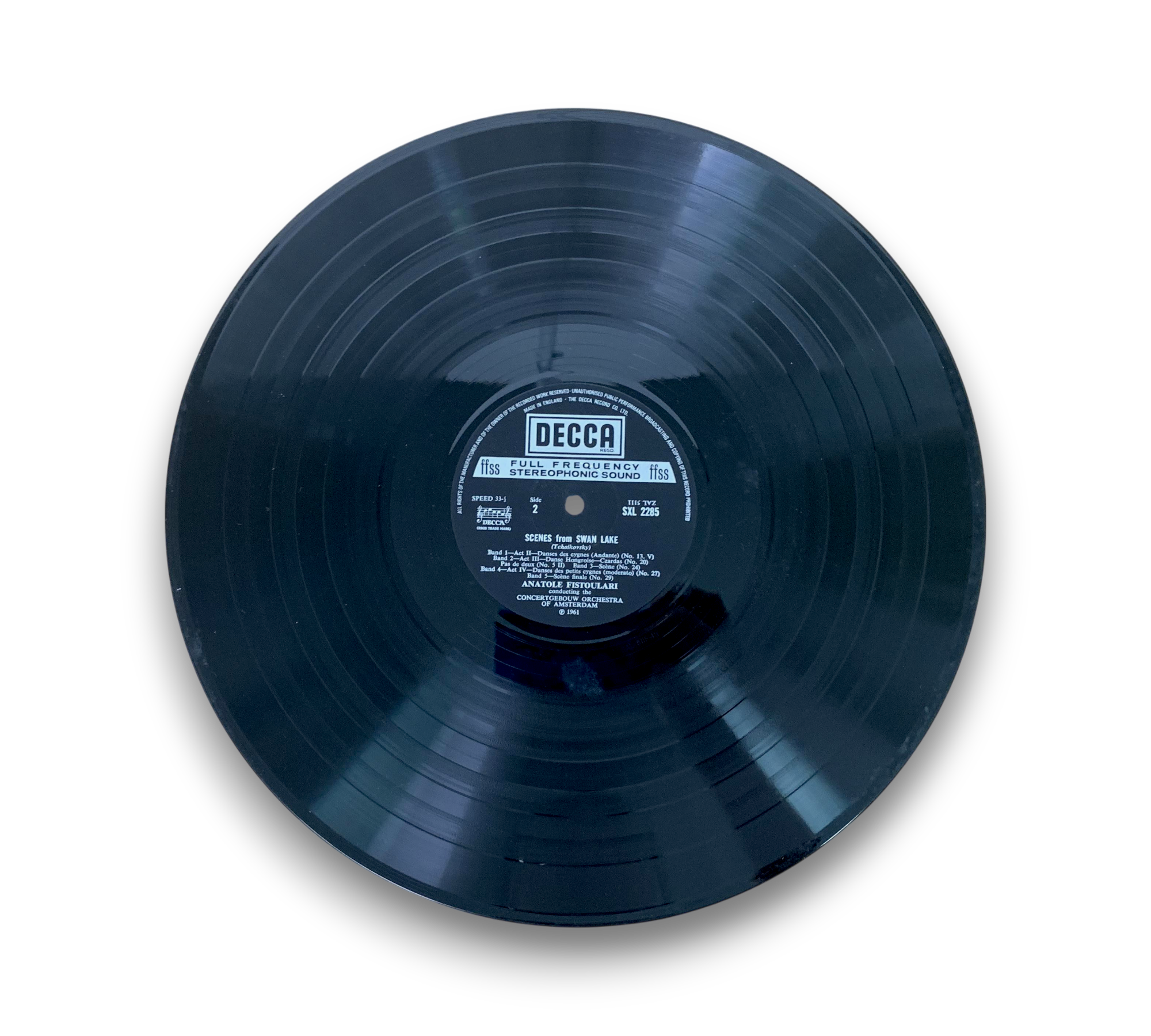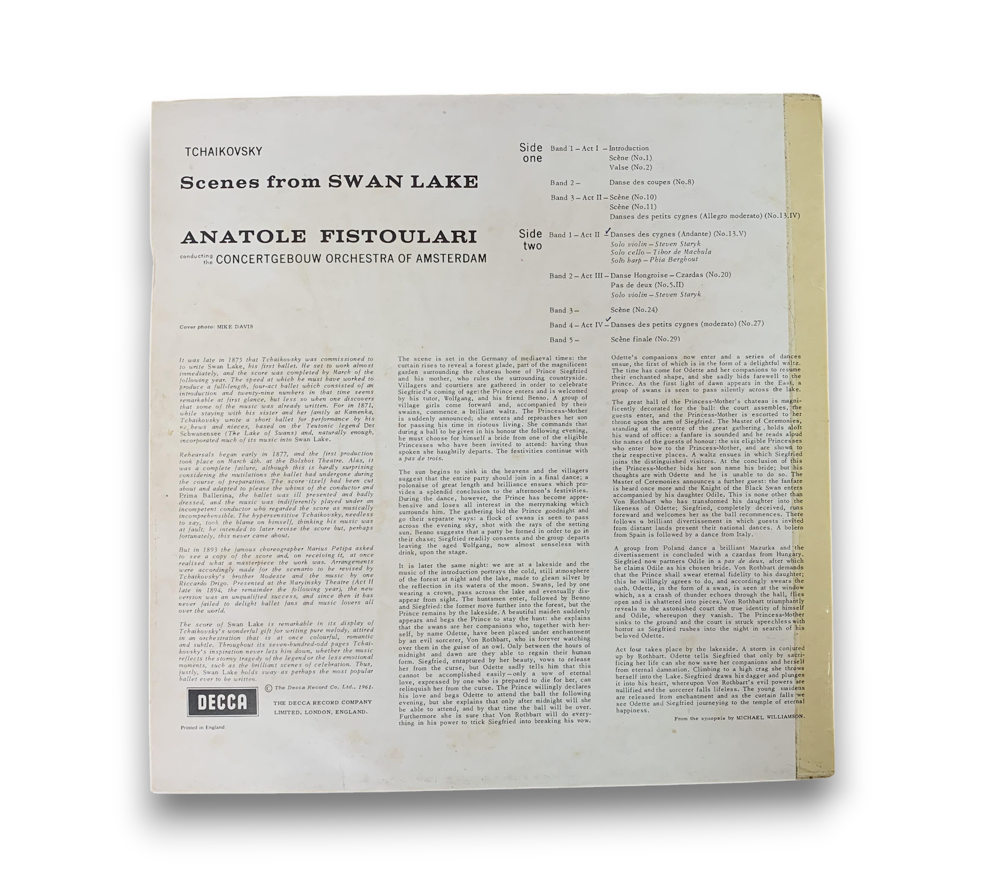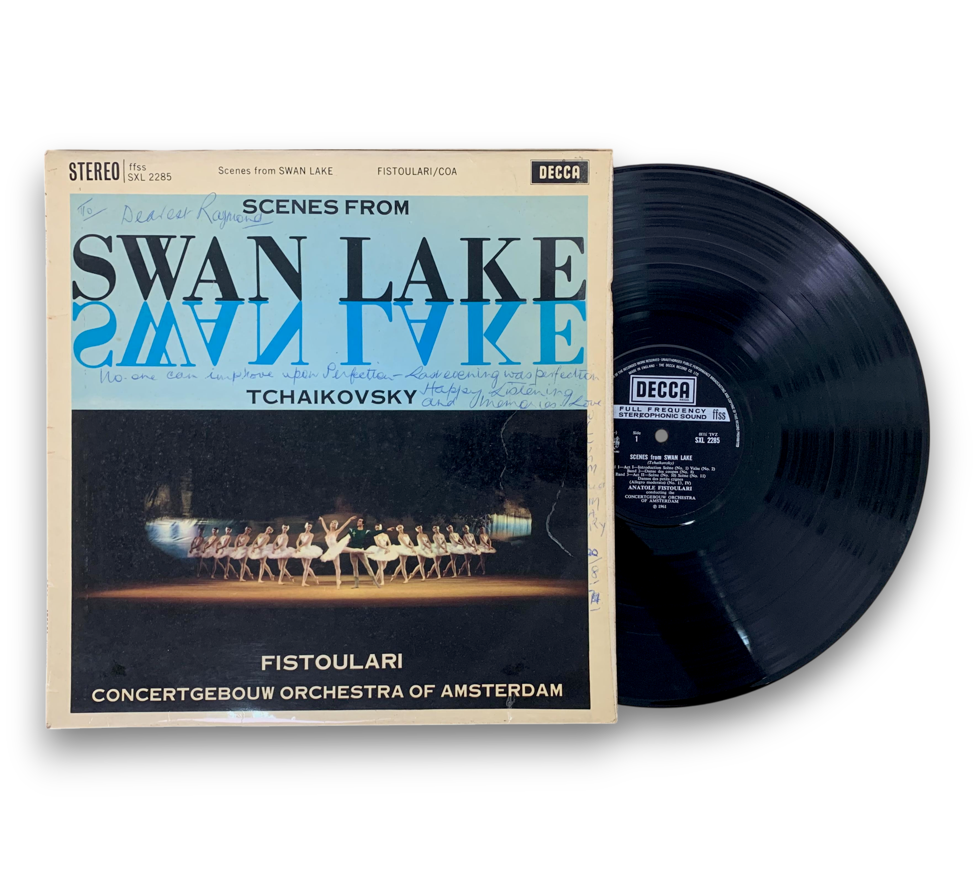 This listing features "Scenes from Swan Lake," composed by Tchaikovsky and conducted by Anatole Fistoulari with the Concertgebouw Orchestra of Amsterdam. The record is pressed on a narrow band and carries the labelography code ED4. The cover shows some signs of wear, and the back includes detailed notes about the composition and its historical context. For further details regarding the condition and any included packaging, please refer to the accompanying photos.